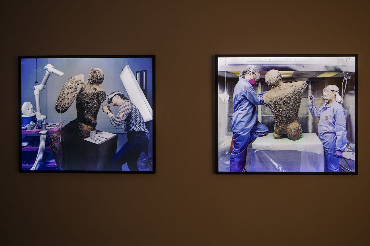 The biennial’s main venue is the Painting and Sculpture Museum of the Mimar Sinan Fine Arts University, a huge, four-story former warehouse on a waterfront in the centre of Istanbul. The exhibition is articulated around two main conceptual paths, which deconstruct deeply rooted narratives that have shaped contemporary society. These paths aim to expose power relations and their bitter consequences and to build new understandings. They operate dialectically by triggering new encounters between humans and other entities. A substantial number of works are concentrated here, and almost all of them have their own rooms, which allows them to constitute their own worlds and opens the exhibition to endless possibilities. This occurs through the play of form, which anchors the ramifications of these historically generated questions to the circumstances currently facing artistic production in a globally mobile world. As such, they put artworks forward as relevant primary sources in their own right. As a kind of energetic system, Extrakorporal (2019) a sculptural installation by the duo Pakui Hardware (Neringa Černiauskaitė and Ugnius Gelguda) dismember a metaphoric body in the age of synthetic biology and regenerative medicine. Machine for Restoring Empathy (2019), by Eva Kot’atková, is composed by pieces of fabric and it represents a laboratory-shelter in order to restore and fix: people, animals, plants, and objects. Gold and smile (2019) by David Douard, introduces magnets, aluminium, metal chains, plastic and ceramics, in order to dismantle elements and components of our modern era. Ungrounding Land – Ljavek Trilogy (2018), by En Man Chang, focuses on unseen human labour and the forced displacement of the proletariat subjected to urban planning decisions of the Paiwan Ljavek community in Taiwan. While, History of a particular nameless creek [Pinna Nobilis] (2019) by Elmas Deniz draws attention the beauty of the lost ecosystem of the ancient site of Gryneion, documenting Istanbul’s urban layers.