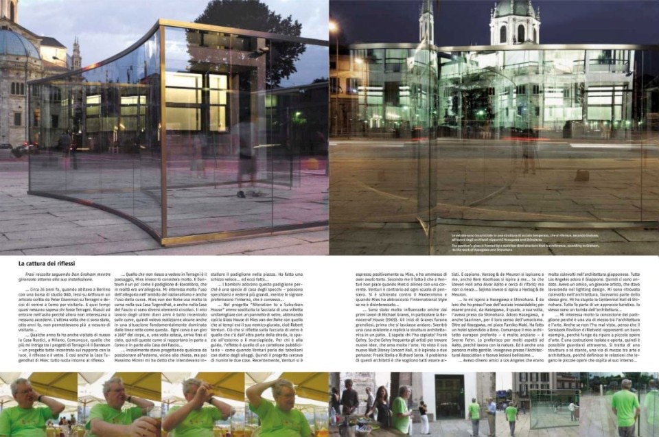 … What I don’t see in Terragni is landscaping. Mies did a lot of landscaping. The Danteum was a little bit like the Barcelona pavilion. It was an allegory. I’m interested in the use of allegory in the midst of rationalism, and also in the use of the curve. Mies van der Rohe uses curves in the Tugendhat house, and inside Casa del Fascio there are several circular elements. All my work in the last ten years involves curves, so I wanted to put some curves in a basically rectilinear situation. The curve is the 360° of the body, and if you extend it you get to the sky, so these curves relate partly to Como and partly to Casa del Fascio.