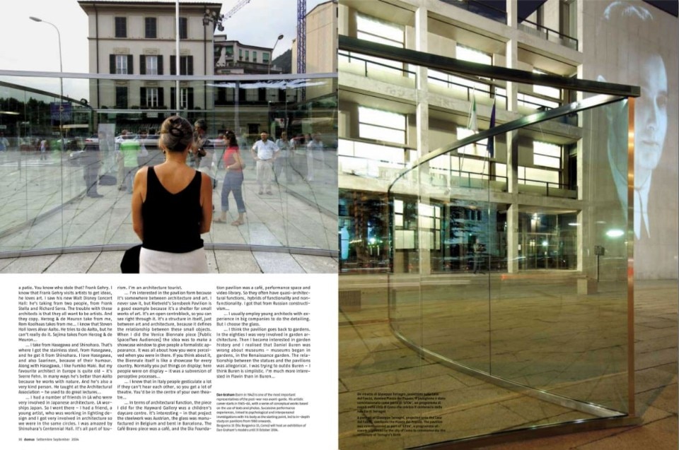 … I think the pavilion goes back to gardens. In the eighties I was very involved in garden architecture. Then I became interested in garden history and I realised that Daniel Buren was wrong about museums – museums began in gardens, in the Renaissance garden. The relationship between the statues and the pavilions was allegorical. I was trying to outdo Buren – I think Buren is simplistic. I’m much more interested in Flavin than in Buren…