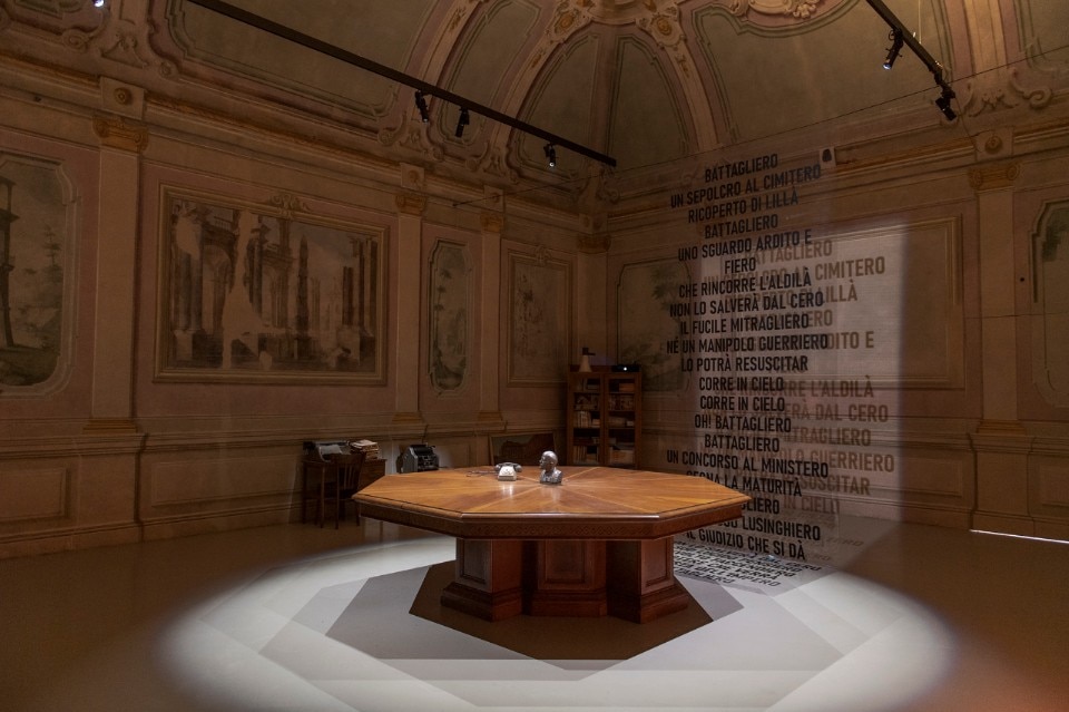 Among the most illustrious pieces that punctuate the magnificent display is the large octagonal table that once belonged to the Reggio Emilia headquarters of the PCI and at which, it is rumoured, [Italian communist leader] Togliatti sat. Built by communist workers under the fascist regime, it was abandoned and defaced so that it would not fall into the hands of the partisans after the fall of Mussolini, only to be later rehabilitated by the party. This and other objects rescued from its historical headquarters (like a Lenin bust), embody first of all with the materiality of their wood and iron all the weight of the 20th century in this corner of Italy. But also what, symbolically, the group incarnated with their enigmatic but deflagrating austerity in the Italian countercultural scenario.
