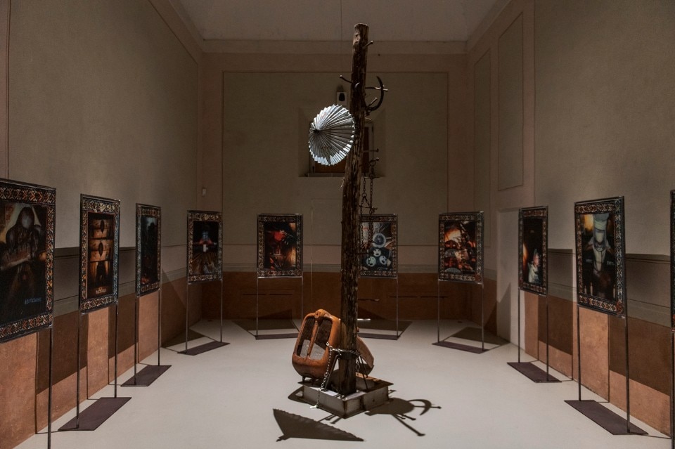 Room after room, a parallel but not apocryphal Emilian psychogeography emerges. The vision of four young musicians - Giovanni, Massimo, Annarella, Danilo - who synthesised with punk irreverence and post-modern stratification an epic and an iconography that brought together the Apennines of army choirs, the Emilian countryside of Liscio dance halls and of work tools, here elevated to the status of performative mediums, with Xerox-printed paper cut-outs and the concrete of Soviet brutalism. Cow chains used as belts, the yoke to accompany the dances, hammers, sickles and bicycle wheels, the Bersagliere helmet sported by Annarella with a black leather biker jacket, the chassis of a rusty Fiat tractor. Emilian-Soviet simulacra that re-emerge from sheets sketched with situationist precision by Danilo Fatur and then brought back into the present around a totem, a beech trunk pierced with nails like a half-spiritual, half-punk Saint Sebastian in the centre of the room dedicated to the album Socialismo e Barbarie (1987).