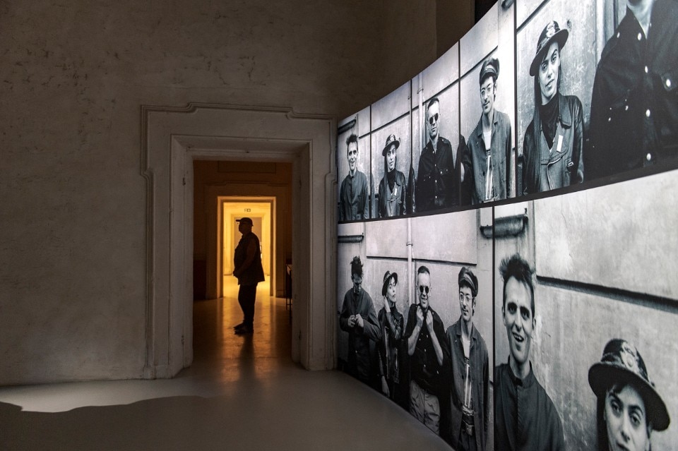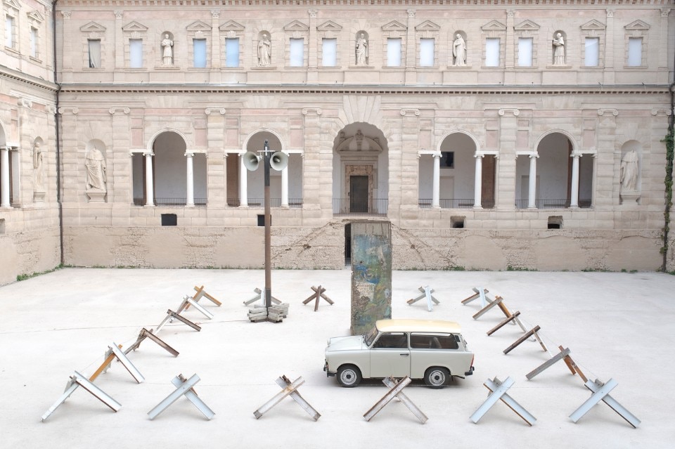 Speaking of '89: a portion of the Berlin Wall towers seraphically beside an old Trabant to welcome the visitors, ripping through the silence of the cloisters with its iconographic force.