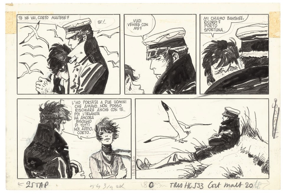 Hugo Pratt began his journey as a fumettista making art in unlikely places. He was a Rimini-born, erudite vagrant, whose most famous character—Il Corto Maltese—became the central force of a feverishly illustrated world. He began life as an artist at age 14, distributing sketches of military highlanders to troops in Ethiopia in the 1930s for entertainment. Three decades later, his beloved protagonist would emerge in Una ballata del mare salato (A Ballad of the Salty Sea), Pratt’s most famous graphic novel.