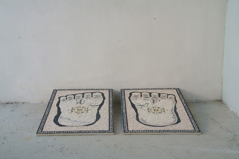 The entire cloister, where the exhibition is set, thus becomes a place of meditation and the other works are gathered around the two central figures. The passage of the Buddha is underlined by two mosaics in the Pompeian style, entitled Buddha is here, where his footprints are depicted, in the centre of which there is a Dharmacakra, the Dharma Wheel, also hybridized by classical culture, where the eight rays are replaced by eight ionic columns. In the continuous play of references between East and West and between past and present that characterizes the entire work, there is the large triptych Reclining Buddha with Volcano where the golden Buddha is lying down, with reference to the iconography of Thai temples, under a porch in a Renaissance square, which is in turn a quotation of the famous painting of the Ideal City (1477), in the version preserved at the Gemäldegalerie in Berlin, on whose background, however, stands Vesuvius.