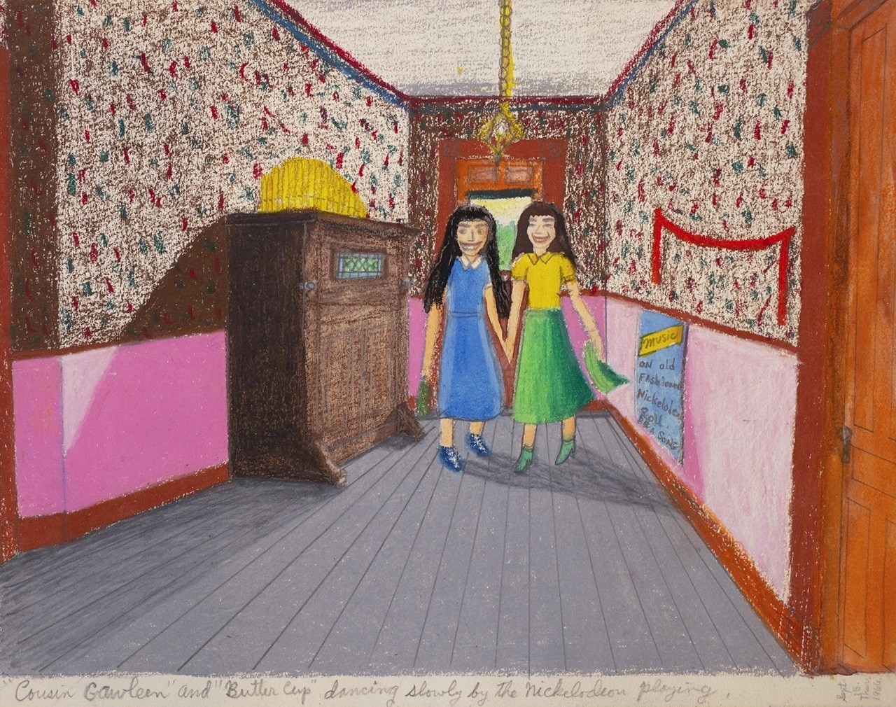 Entirely self-taught, Aiken gradually drew attention to her lyrical images of life in a parallel Vermont. Prolific until her death in 2005, she produced over the decades a series of paintings and drawings that often combine narrative text and image, as well as cardboard cut-outs and books. “Interiors” focuses in particular on Aiken’s drawings, which depict domestic scenes teeming with youthful revelry and malice. Although Aiken herself was not known to be malicious, the artist's rebellious nature is revealed through the actions and expressions of her teenage alter egos. Never deferential, the Raimbilli cousins consistently react to situations with exuberant disobedience, defying the usual constraints imposed on children's conduct. With its fascinating details and lively manner, however, Aiken’s work also suggests the threatening underground currents that flow through American rural life and small city communities. Several drawings exhibited in “Interiors” are explained by the artist’s handwritten reflections, which contextualize the events taking place in her deceptively conventional world. In addition to this, characteristic elements of the American folk tradition, such as the precise description of clothes, furniture and details, can be found in her work.