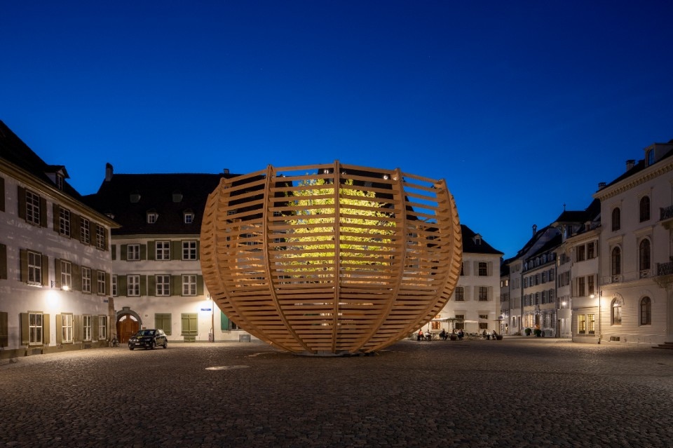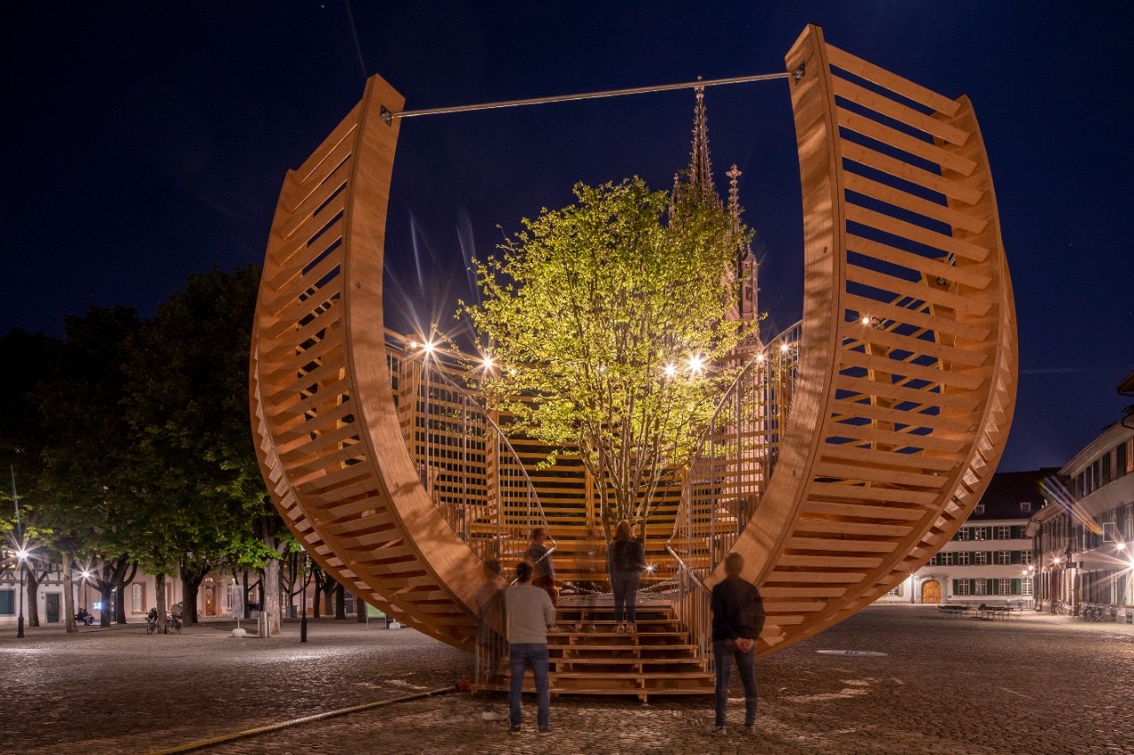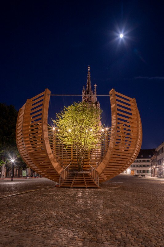 In "Arena for a tree" a solitary tree is positioned in the centre of a public accessible arena. The basket-shaped structure imitates the irregularities and twists of a tree. With a diameter of 12 metres and a height of 8 metres, the Arena - designed in collaboration with Schnetzer Puskas Ingenieure - can accommodate up to 50 people. At first glance, the work might suggest a "denaturalisation" of the tree into a work of art to be contemplated and protected. On the contrary, the artistic intervention proposes to erect the tree itself as a symbol, an "ambassador" of nature, as well as a testimonial for the exhibition and its message. The tree was carefully selected by the Swiss landscape architect, Enzo Enea, not on the basis of aesthetic considerations but envisaging its possible integration into the Basel tree population and the long-term adaptation of its species to the altered conditions provoked by global warming.
