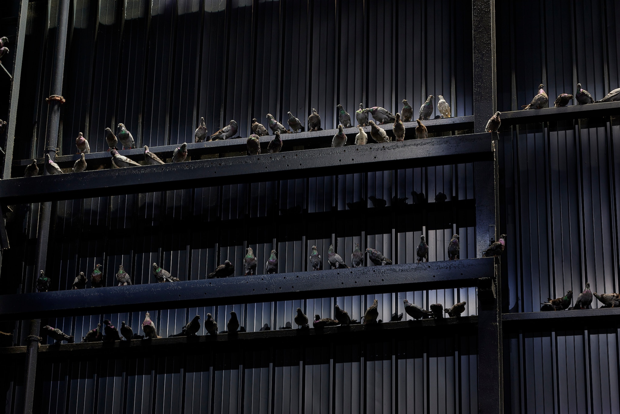 The entire length of the Hangar’s side walls is inhabited by thousands of taxidermied pigeons: they stare at us; the positions are reversed, we are the ones who become a sort of attraction to their tiny eyes. Silently, in the half-light, through a rarefied atmosphere, the birds remind us of the impending end, of the inevitable judgement, but they also show us that “they” represent a true community, unlike our humanity, which has never been as fragmented as it is today.