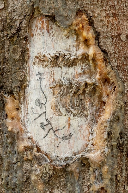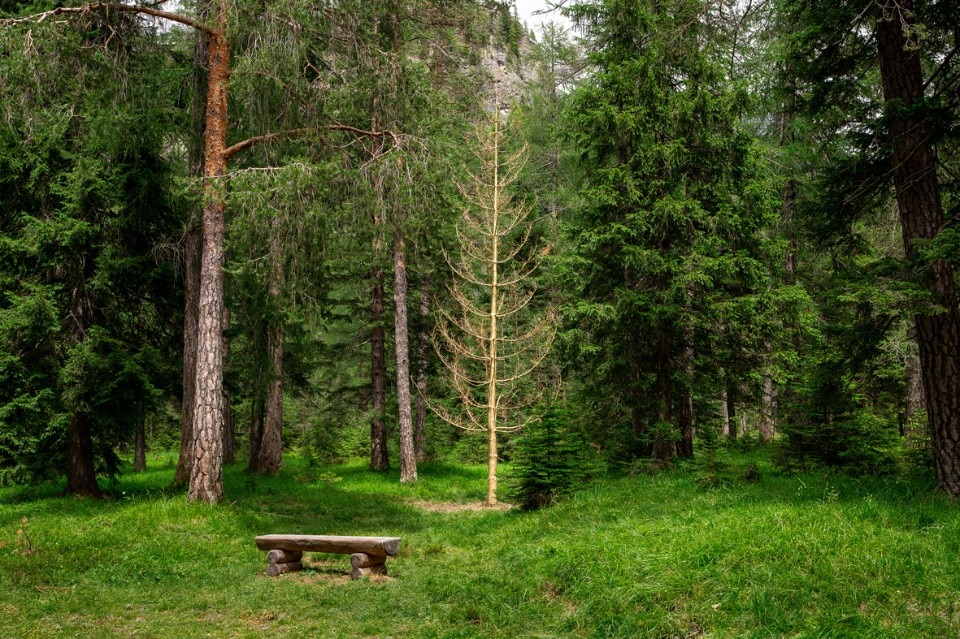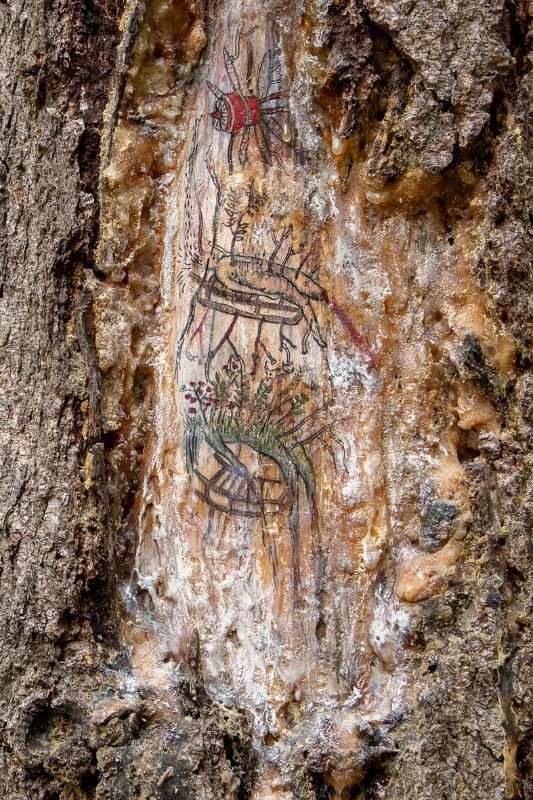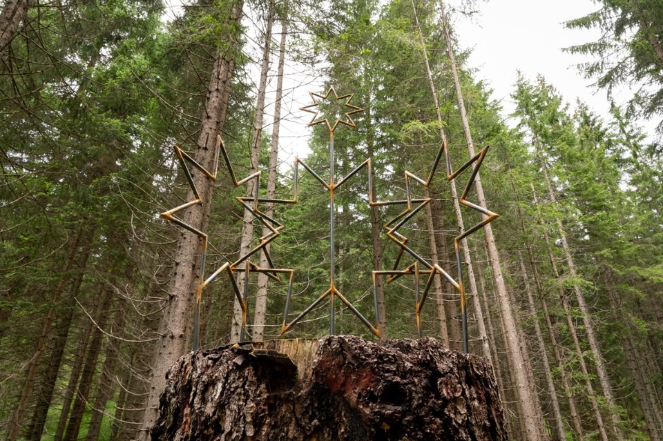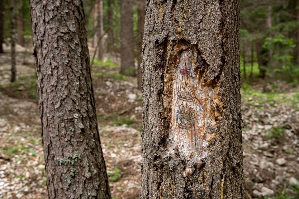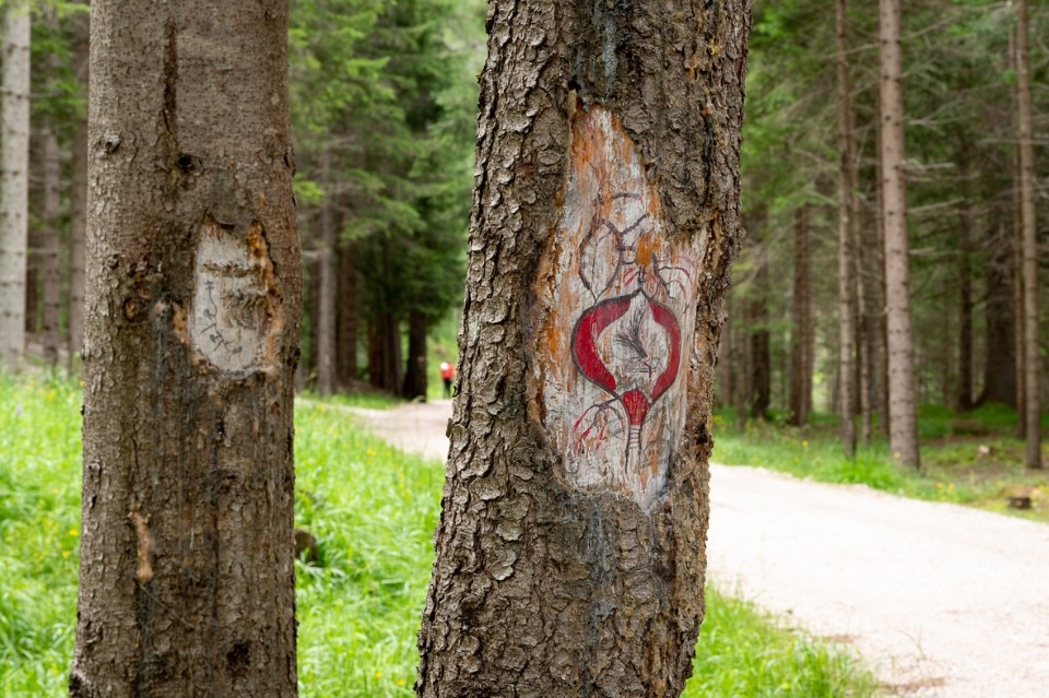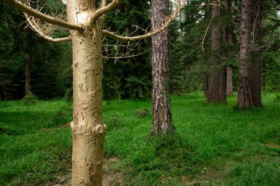 Dado's "Magic Tree" was created by painting in gold one of the trees in the forest crossed by the Pian de ra Spines path. An intervention that brings the world of fairy tales into the forest, an "enchanted element" that stands out and yet coexists with the natural elements that surround it.