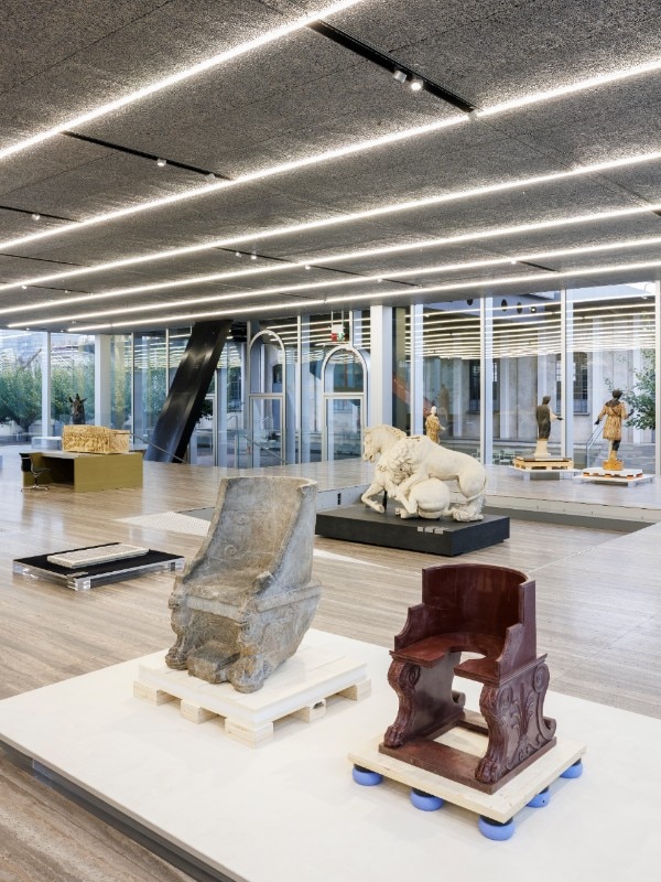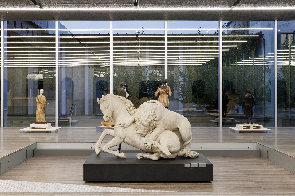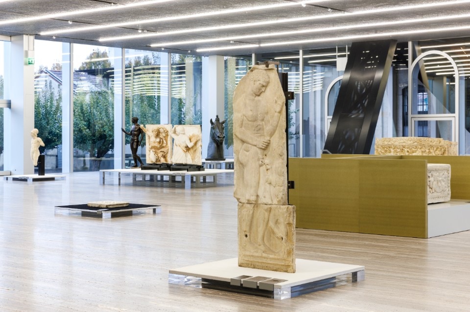 In the Podium, on the other hand, a synchronic assemblage is carried out in which all elements appear simultaneously to the visitor’s gaze and whose purpose is to compare many different biographies, organized by coherent semantic sets. At the showcase in the background there are statues that reuse ancient fragments to create a modern composition.