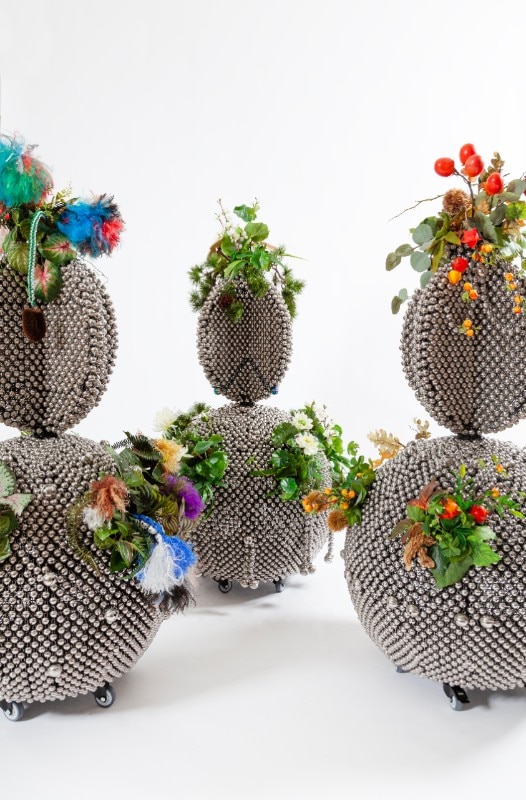 Haegue Yang, Sonic Female Natives, 2023 (detail). Powder-coated steel frame, powder-coated mesh, ball bearings, casters, stainless steel bells, PVD-coated stainless steel bells, split rings, artificial plants, dried ginger, dried tree-ear mushroom, pine cones, floral tapes, wires, brooms, nylon cord, rope, scrubbing brush