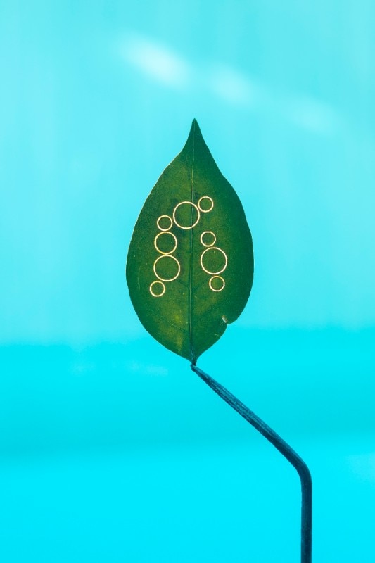 Mendes Wood DM, dried leave (ligustrum japonicum), metal stands and slide projection (filter ref. 306 summer blue