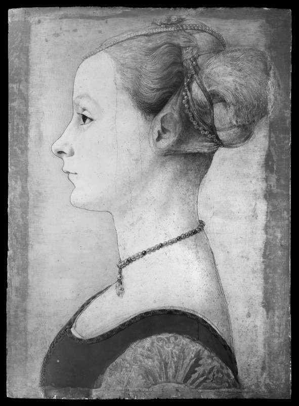 Pollaiolo’s hand can be recognized in the meticulous attention to detail, in the almost Flemish rendering of pearls, hair, and lighting effects, which reveal a new sensitivity toward the phenomenal reality. The painting, dated around 1470-75, belongs to a series of female portraits the artist created during those years, evidence of an era in which art became a mirror of society and its values.