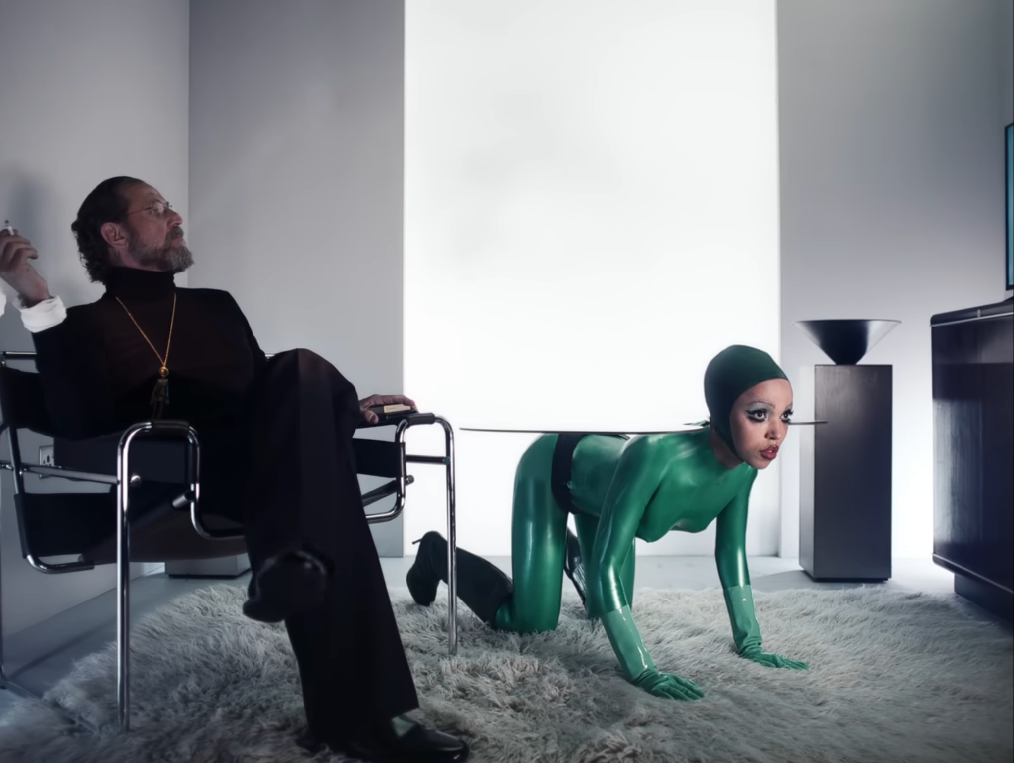 In this frame, FKA Twigs reinterprets Allen Jones' provocative Green Table, placing it within a context of liberation and identity transformation.