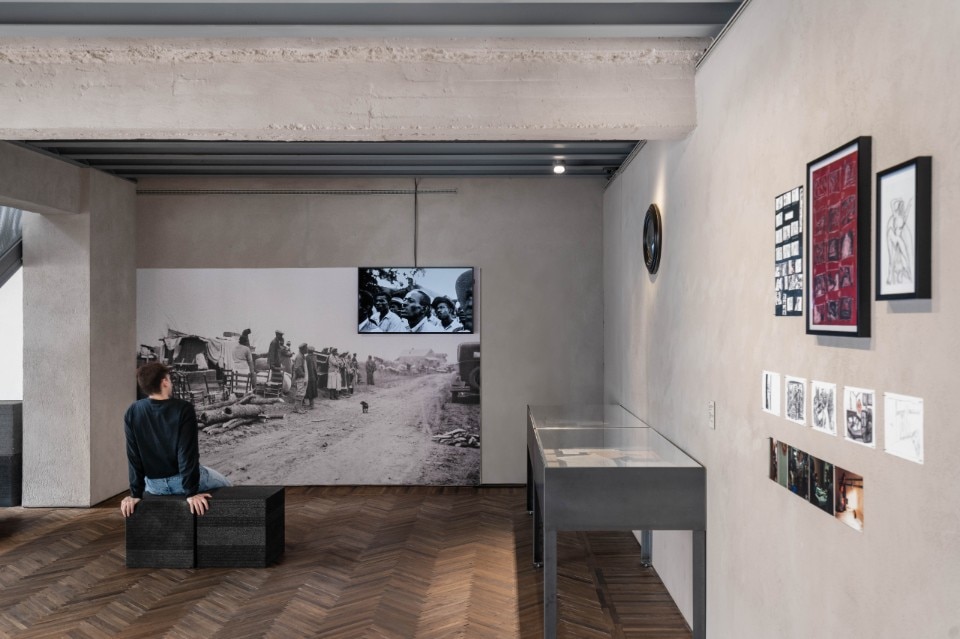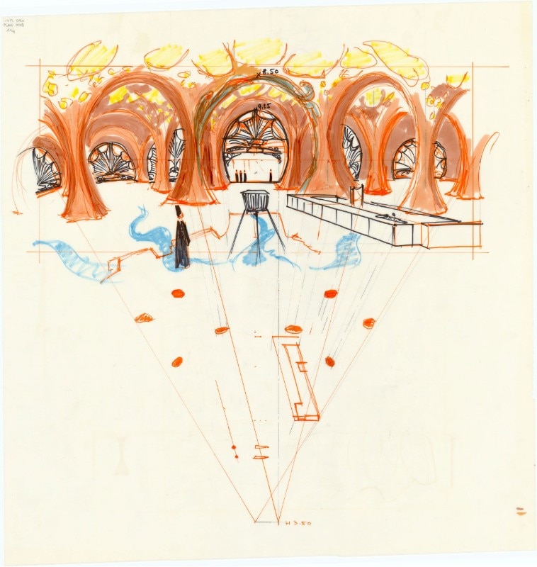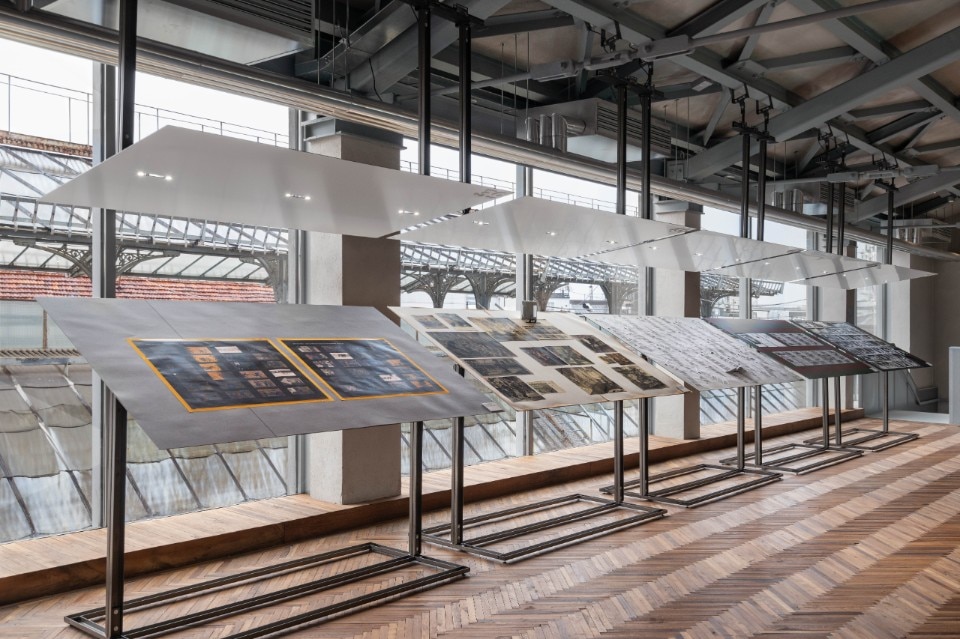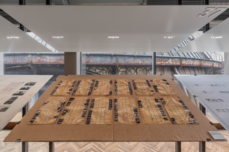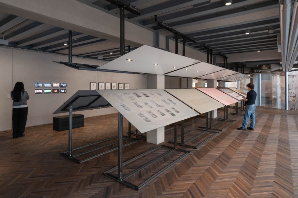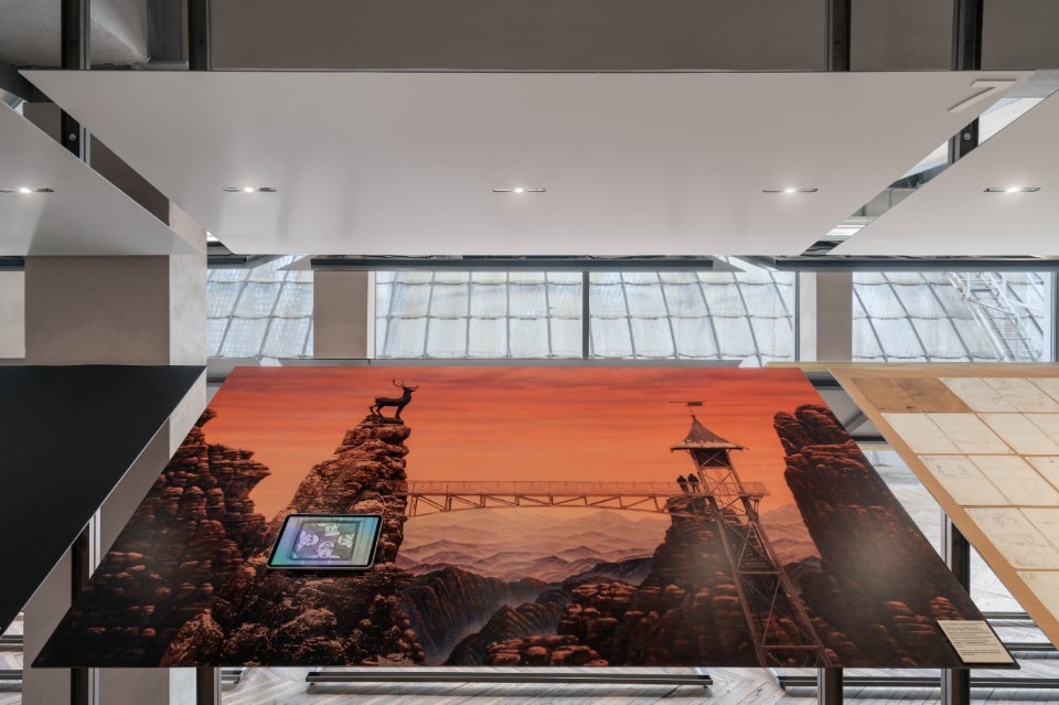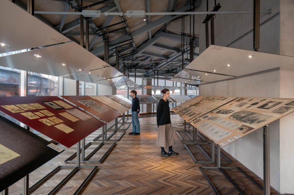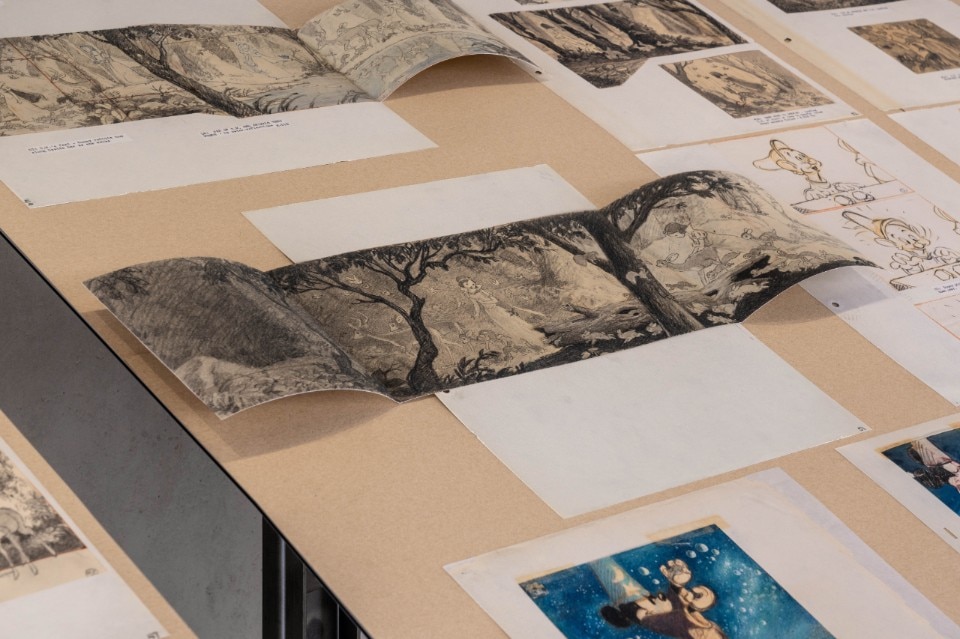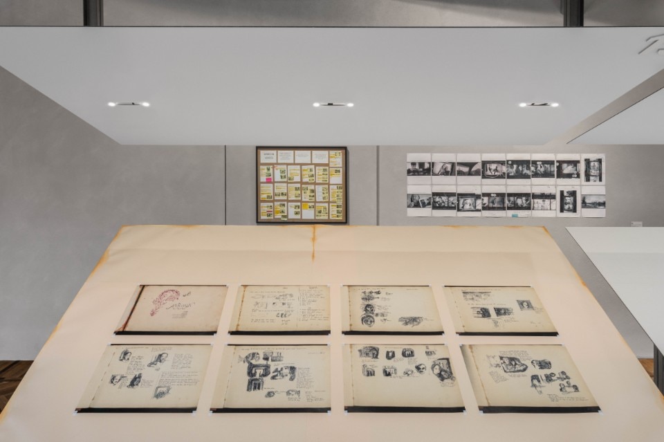 Translating storyboards into an exhibition is a challenge—otherwise, it’s just a lot of sheets of paper pinned to walls. Berlin-based architecture firm Sub’s Andrea Faraguna tackled this by designing an immersive, work-in-progress environment. Old-fashioned drawing tables, tilted at precise angles, evoke the traditional tools of the storyboard artist. Overhead, a mirrored installation reflects and multiplies the sketches, suggesting the sequential nature of a film reel. “We wanted to frame things, to highlight the precision of the hand, the moment when an idea first takes form,” says Faraguna.