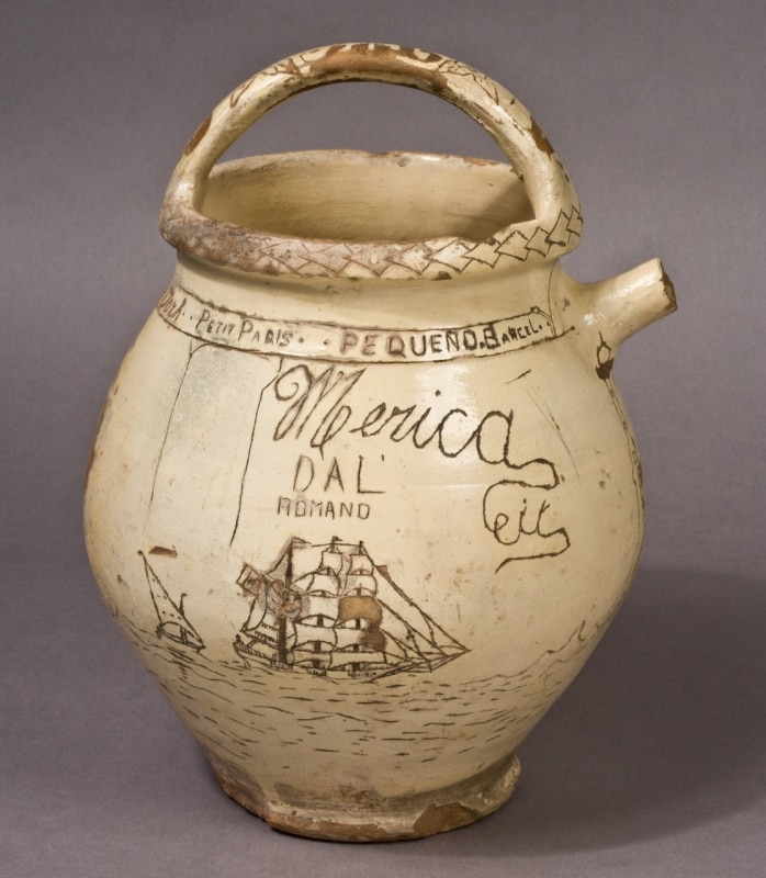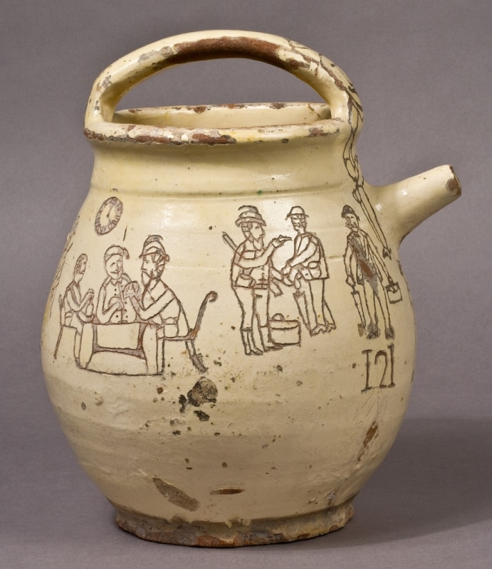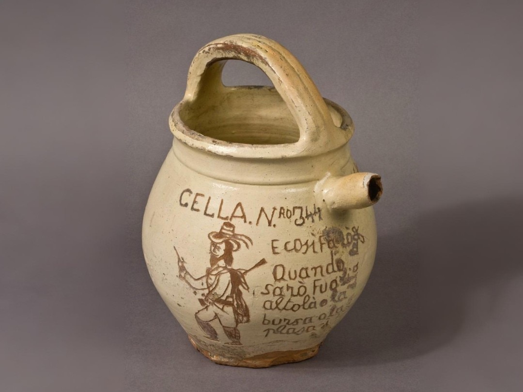 They were everyday objects, meant to hold water or food, yet for those who engraved them they also became a means of expression. Prisoners used whatever was available: the glazed clay of the jars and improvised tools — often pieces of metal or nails — to carve words and images into their surfaces.