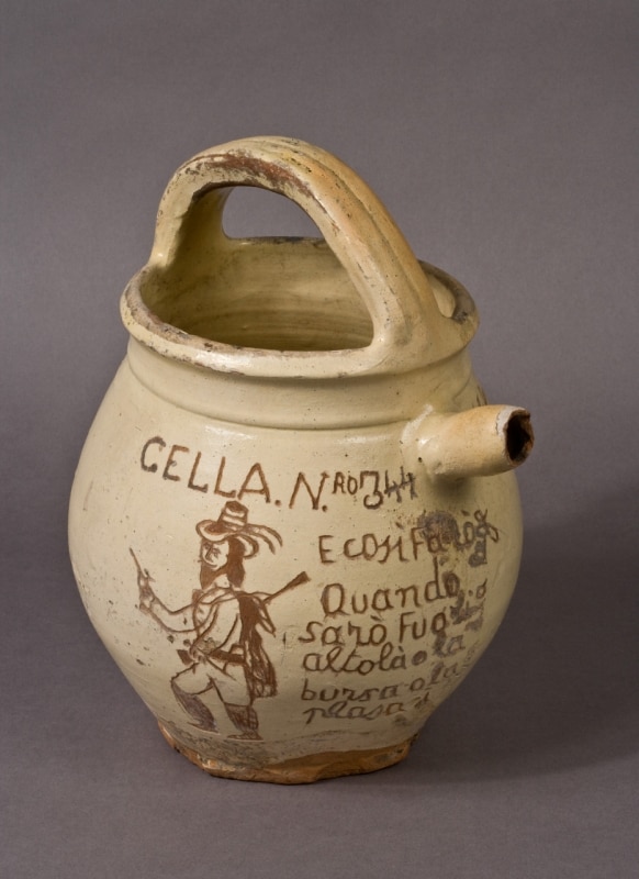 This relationship between utility and meaning, between matter and thought, emerges vividly at the Museum of Criminal Anthropology “Cesare Lombroso” in Turin. Among skull casts and measuring instruments, the museum preserves a remarkable collection of eighty terracotta jars and pitchers engraved by inmates of “Le Nuove” prison between 1870 and 1916.