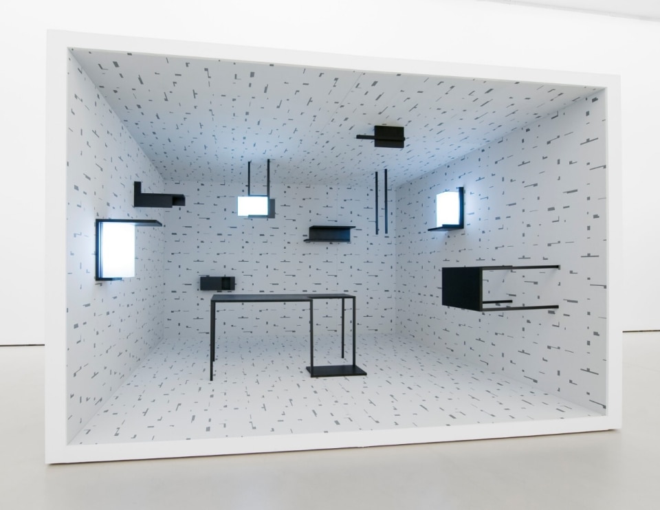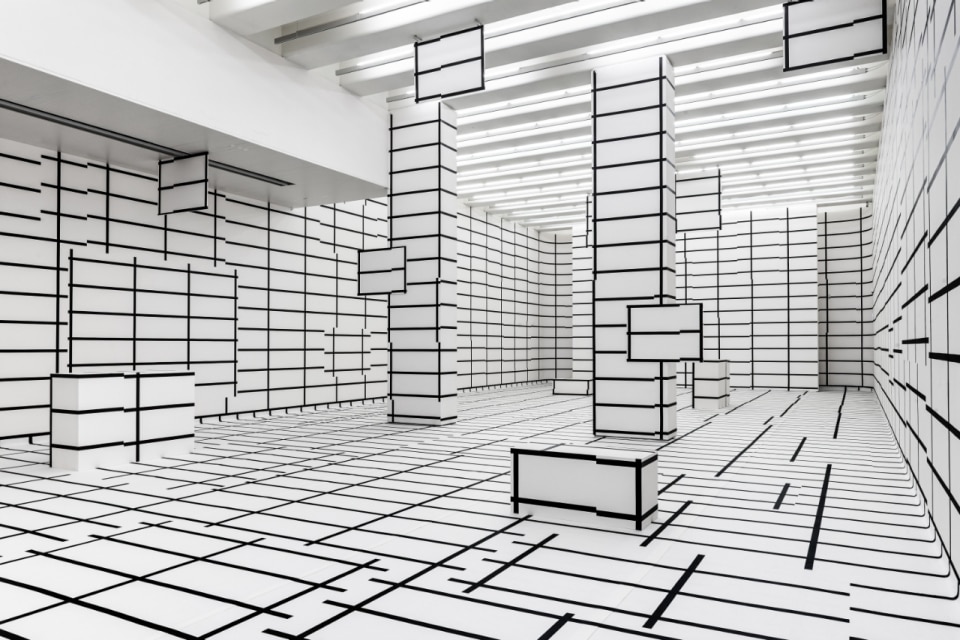 The intervention engages the entire space, from the walls to the ceiling and the floor, treating it as a single visual field. Black lines extend seamlessly and envelop the environment, dissolving the distinction between vertical and horizontal surfaces.