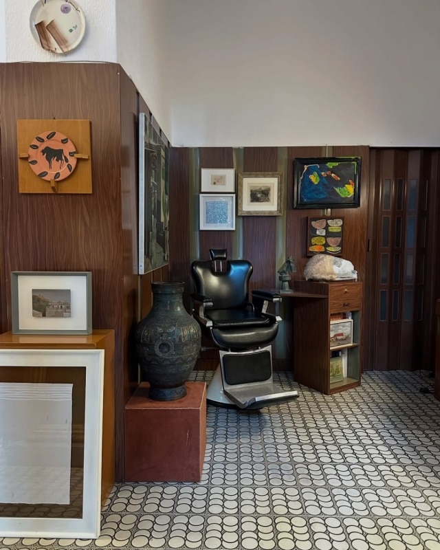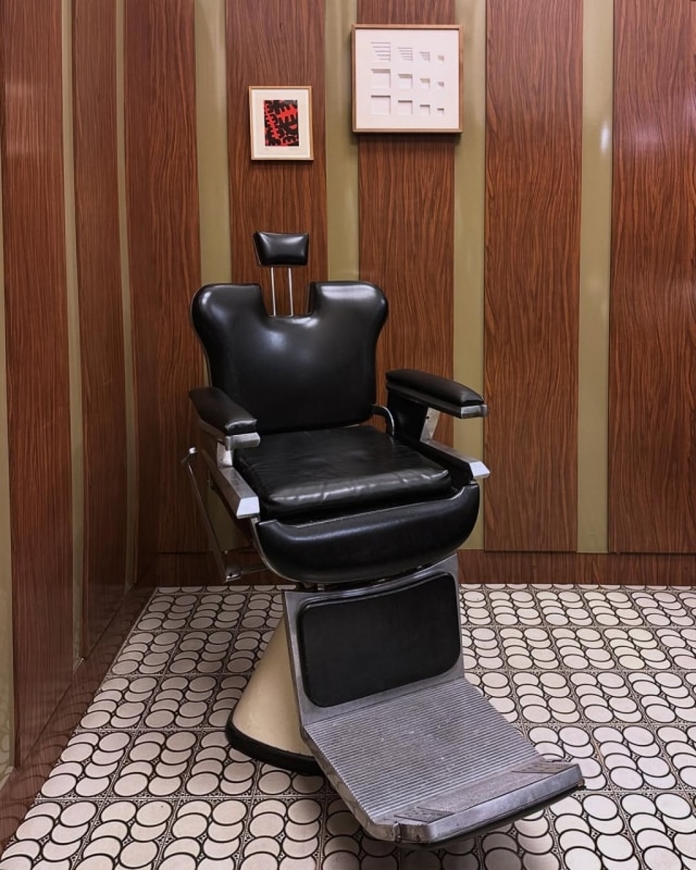 Inside, the barbershop is still there. The ceramic sinks, the black chairs with chrome bases, the black-and-white circular tiled floor, the dark wood paneling rising halfway up the walls. Even the small side booths remain, tucked behind sliding doors.