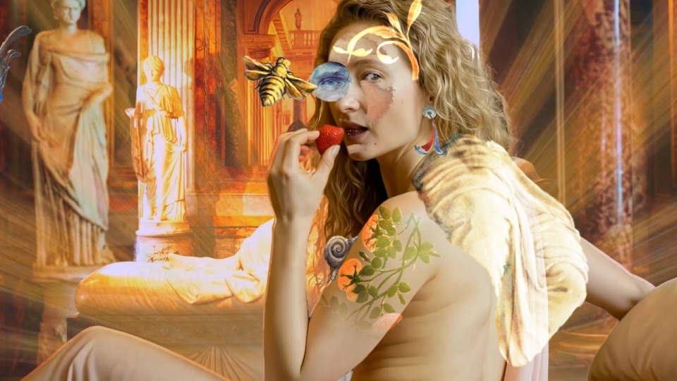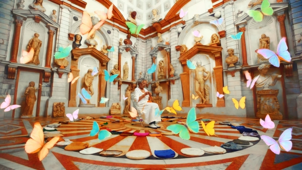 Colors are saturated and the atmosphere evokes an Italian summer. Paintings by great masters and graphic interventions by new generations of creatives seem to emerge directly from the screens of mobile phones. The editing is fast and layered.