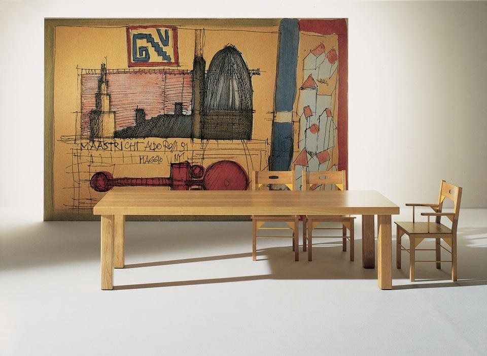 The 1970s ended for the architect with the beginning of the project for the Cappella Molteni in the Giussano cemetery, which was constructed between 1980 and 1987, and was an opportunity to work once again with his friend Luca Meda. Having become the art director for the Molteni family’s furniture company (Molteni&C and Unifor), Meda involved Rossi in what were to become his first design projects. In the space of just a few years - mainly together with Meda - he produced the “Capitolo” sofa (1981), the “Teatro” (1983) and “Milano” (1983) chairs, the “Carteggio” bureau (1987) and a number of contract projects such as the prototype chair for the Teatro Carlo Felice of Genova (1988), a building which Rossi was also working on together with Ignazio Gardella and Fabio Reinhart, and the furniture for the Bonnefantenmuseum of Maastricht (1990-1994). Along with the Brianza-based furniture company, Rossi also began collaborating with Alberto Alessi, for who he designed items such as his personal contribution to the “Tea & Coffee Piazza” (1983), which was produced in a run of ninety-nine pieces in hand-worked silver, and the “La Conica” coffee maker.