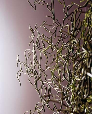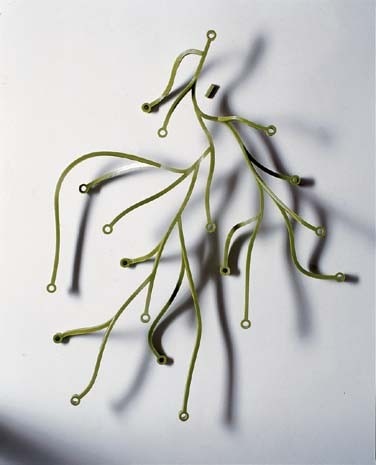 At first sight Algae does not reveal the logic of its underlying possibilities. The connecting joints are situated on different planes, so the construction can grow in all directions in space. All this vanishes in the impression of an irregular form growing spontaneously. Furthermore, the material makes the form flexible, so that it can be deformed to absorb any eventual difference.
