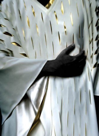 I have always been struck by the strict codes that regulate every single moment of the liturgical celebration. Each element deeply fascinated me for its immaterial value. Rather than working on the symbolic nature of the colours, I preferred to concentrate on the amount of light reflection. In this way I was able to work on the brilliantness and vibration of light. Gold has been used a great deal in sacred garments, but it is a metal that needs to be woven into the fabric. However, in modern times we see the use of a metallic yarn called Lurex. It is very shiny and used a lot in haute couture to decorate evening wear, producing results that are both sophisticated and vulgar. My idea was to “laminate” the surface of the material in order to obtain an effect that is shiny and more metallic.