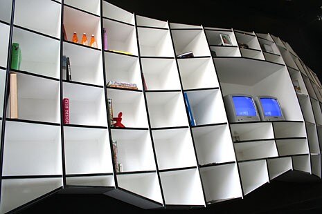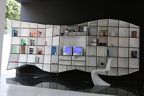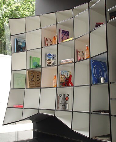 Supports and shelves can be inclined and folded at different angles, to the point that the lacquered MDF structure seems to become almost elastic, adapting itself to even the most improbable spaces. The shelves can be closed or open and sized to hold books, objects, plasma or LCD screens and computers. Five sizes are available (S, M, L, XL, XXL) in 17 colours. E.S.
