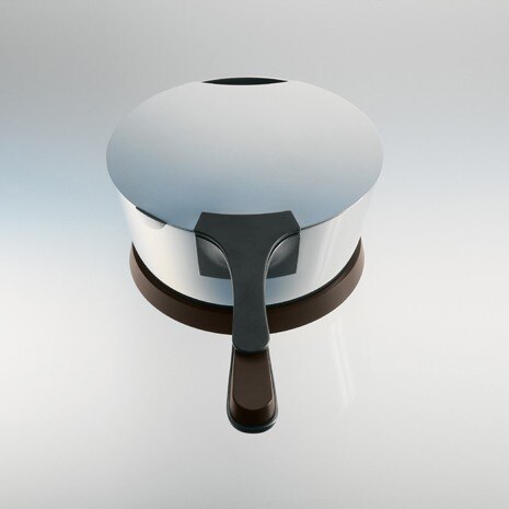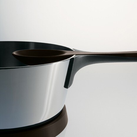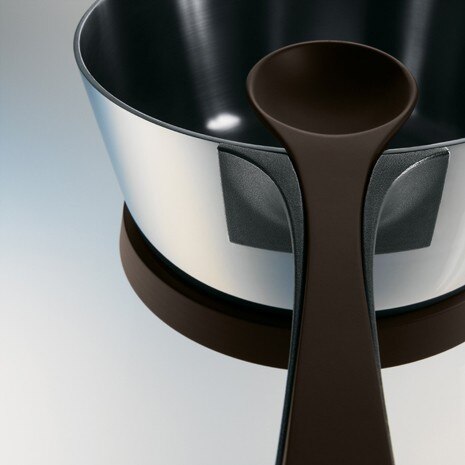 For his part Jouin designed a conical shape casserole dish made from trilaminate to distribute the heat uniformly across its surface, the melamine spoon can be placed in the handle while cooking and finally the cuts in the lid allow the steam to be released. E.S.