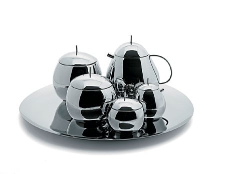 Today Fruit Basket retains the original poetic inspiration with a set of two cups and four teaspoons, a teapot, sugar bowl, milk jug, a round or concave tray, containers of various sizes all in stainless steel. F.C.