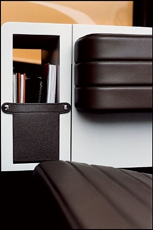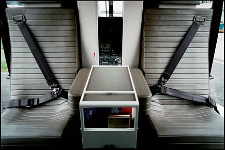 Pezzini’s work on the interior is entirely focused on improving the arrangement of space and its functionality. He has divided the available area into three independent volumes: the cockpit is partly separated from the passenger area, which is accessed via sliding doors, by a transparent glass partition; the cargo boot, accessible only from outside by two doors, has been equipped with a shelf to separate luggage from coats. The choice of colours also helps to divide the spaces perceptively: with dark brown for the pilots’ area, and mainly beige for that of the passengers. All the metal parts of the inside wall are faced with “toile H”, the famous 1930s’ fabric which originally covered the Paris fire brigade’s hoses and was later used by Hermès for its bags, due to its formidable resistance. The choice of this fabric for the internal facings of the helicopter also brought in another departure from common standards: the introduction of safety labels in jacquard fabric instead of the traditional adhesives. This is another styling detail, but also the designer’s signature, for Pezzini has always been interested in materials taken out of context. In this project he has used leather for all elements in direct contact with passengers and crew: the pilots’ and the passenger seats, the side pockets, and the surface tops between the two seats. Only the know-how of Hermès’s master craftsmen could enable these materials to be used in a helicopter while complying with the stringent fire safety tests and maintaining the maison’s high quality standards. The biggest difficulties were encountered in the treatment and processing of the leather. Fire-resistant treatments normally make the leather less soft and also tricky to upholster on rigid surfaces. The extent of the EC135’s transformation is indicated by the number of applications submitted to the certifying authorities, resulting from more than 50 alterations. “My work on the interiors is based on simplification, the clearing of spaces and also on achieving a perceptive functionality,” explains Pezzini. “The choice of horizontal stitching on the seating and on the floor mats goes in this direction.” All in the interests of comfort and relaxation, made still more important to people when flying in such a small and seemingly frail aircraft as a helicopter.