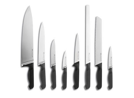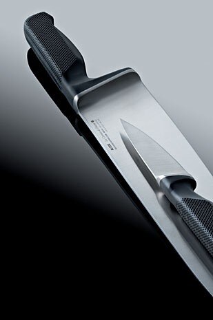 Gozzi treats the cooking materials like a tailor’s tools, injecting them with new life and physiognomy, however ephemeral, while deftly handling the carving knife or fruit-peeler. Dreamily he reminisces on the prehistory of modern cuisine, when a single knife (the carving knife of course, his favourite) could be used to prepare, serve and even to eat meat). But he quickly recovers, and almost flirtatiously exalts the ergonomic qualities of his knives’ handles. Certainly they are just right, and absolutely safe, in the delicate hands of the ladies who, from kitchen to table, want to be able to do everything nicely.