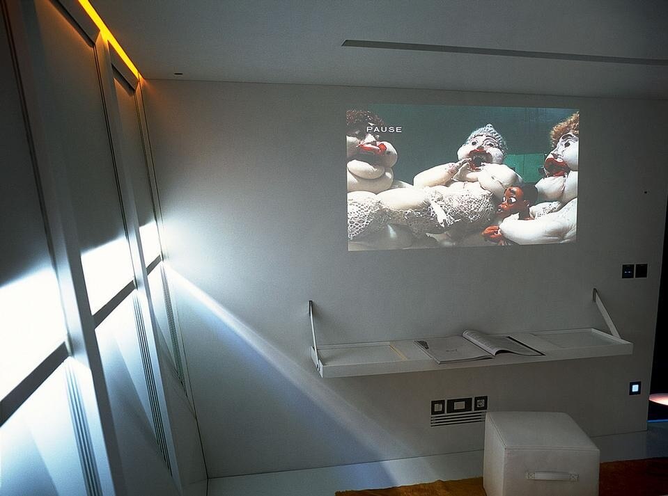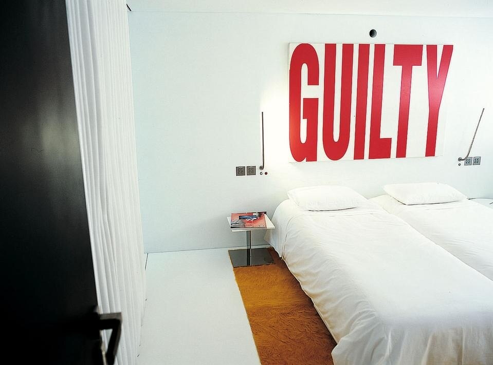 The result is Guilty, a travelling manifesto that accommodates pieces by different artists in its interior. Their works seem to have been born alongside the choices made in the design. Corian floors and sides take on the colours of the changing natural light filtered through the glass, while in other areas white surfaces are covered with works of art, giving every part of the boat a unique personality.