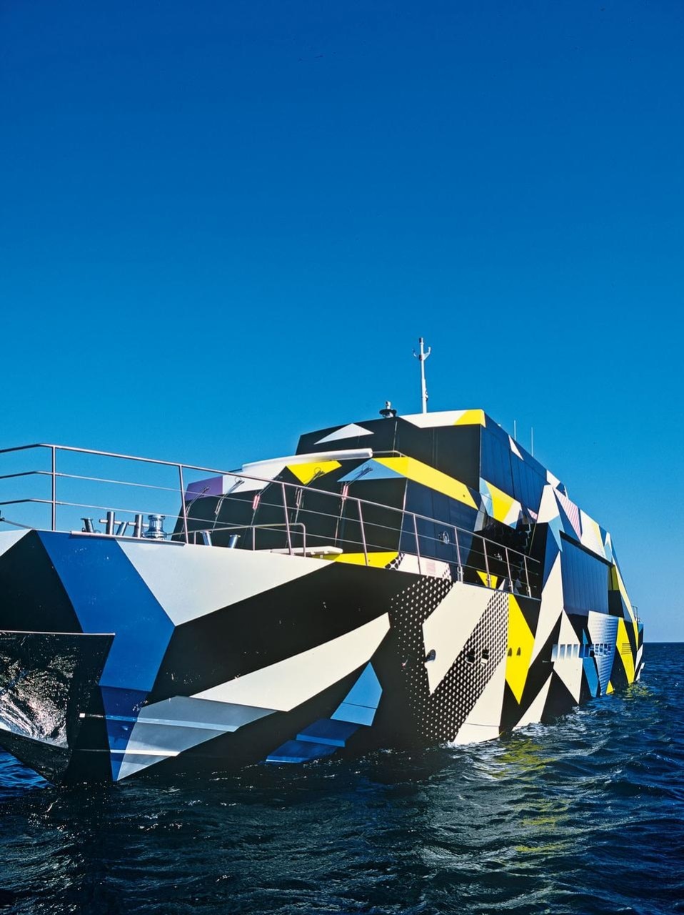 Mimicry is well known in nature. Animals and plants exploit it to defend themselves or to attract prey, and its military applications are also extensive. During World War I, German U-boat commanders were often deceived by ships painted with mimetic designs that broke up the outline of the hull. This made it impossible to identify the class of ship and determine course and speed using a periscope alone. Thanks to “Dazzle painting”, or “Razzle Dazzle”, a camouflage pattern invented by the British artist and naval officer Norman Wilkinson, many ships escaped torpedo attack. The technique’s effectiveness declined with the advent of radar and sonar, but the history of cleverly disguised boats (whose designs were often inspired by cubism) deserves to be told in greater detail. Ivana Porfiri was convinced that, due to the distinctiveness of the overall architecture, the boat she was developing needed this kind of treatment: not just colour but camouflage. She telephoned Dakis, who happened to be in the studio of his friend Jeff Koons at the time. As the three of them talked they became excited about the unanticipated characteristics that the project was assuming. Koons immediately volunteered to do the artistic work, the client accepted, and the designer took up the challenge of applying complex camouflage to the boat.