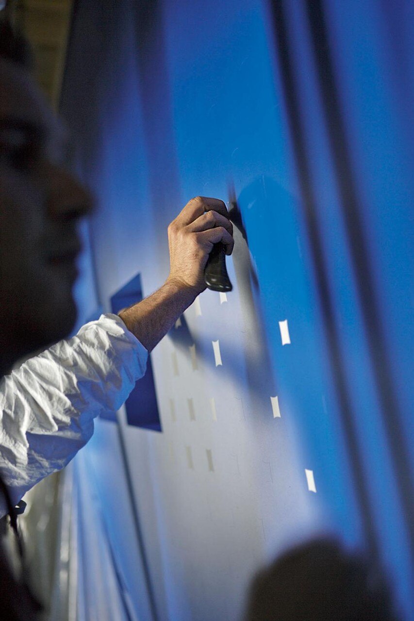 Dakis Joannou is a client with whom Ivana Porfiri has established a particular rapport. The effects of this special relationship have been surprising, especially since they unveiled the result of their latest collaboration. Dakis Joannou is a famed Greek art collector. He spends a lot of time on his yacht, which he uses as a home and a means of transport between the islands of the Aegean – and all without giving up art. Until a few months ago, his seafaring gallery was the Protect Me from What I Want, a traditionally designed boat that was also the work of Ivana Porfiri and was named after a piece by Barbara Kruger. The client did not want there to be any restrictions on the new boat (RINA Maltese Cross class), except those dictated by the size of Joannou’s moorings. The limited dimensions inspired the design process from the outset. Cutting away the bow is a tactic often adopted by ship-builders to gain length: once the boat has cleared official checks, the bow takes on its original shape again by replacing the part that had previously been removed. Designer and client agreed that there was no need to resort to this kind of “prosthesis” for the new boat. The snub-nosed cut made for practical reasons would remain, in effect, as a cut of the hull charged with great symbolic value. The line of the bow appears reversed next to the hawse, the hole through which the anchor cable runs. The cut was made on a fibreglass hull produced using a mould that was already in the shipbuilder’s possession. The water-lines remained the same, but the process of transforming a traditional hull had begun. While we were talking, the designer showed me a tiny boat made from stylised wood in three overlapping pieces. “This is the design that I had in mind from the start. Its simplicity sums up the research that led me to the design for Dakis Joannou’s new yacht: a standard hull, an intermediate space for laying out the bridge and communal areas, and a separate upper level, set aside for the owner. The surfaces of the glass sections are larger than usual and they are almost vertical (the angle is around 15°). Visibility of the outside is surprisingly good, especially in the owner’s area. This is often compromised by the streamlined shape of traditional boats. Here we have integrated design at the service of mobile architecture, a prototype for a new kind of boat.” The blocks have been designed to reflect the composition of the interiors and their surfaces. While the bow seems deliberately inverted, the treatment of the surfaces draws on a paradoxical use of camouflage.