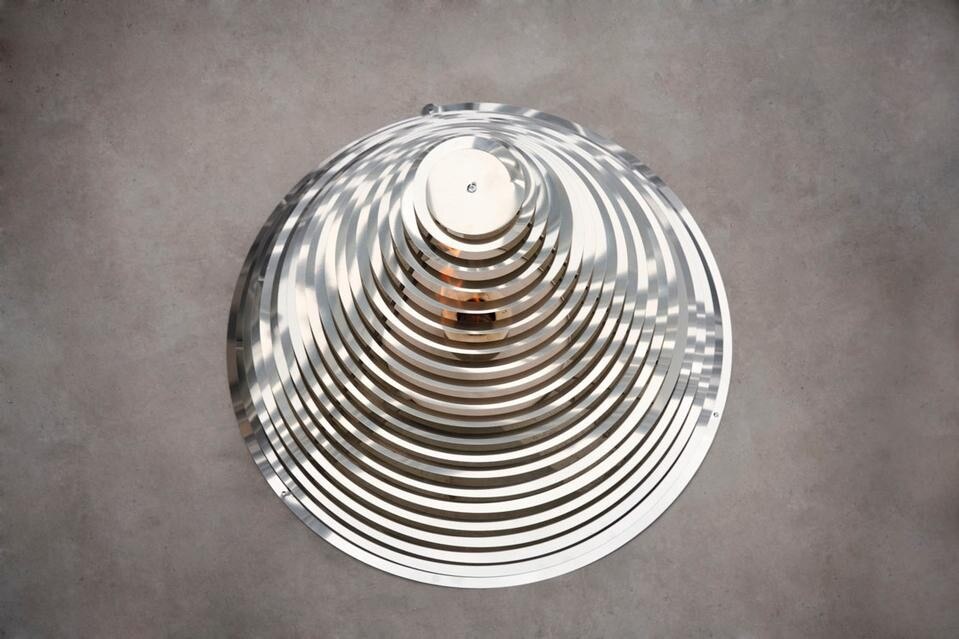 www.giovannicrosera.com . Archimede (2010): Bioethanol outdoor fireplace. The baffle is made from a single laser cut from a sheet of stainless steel. John Arch Crosera with Mario Mazzer. Manufactured by ACQUAEFUOCO wellness mood. Photo by Joe Murador