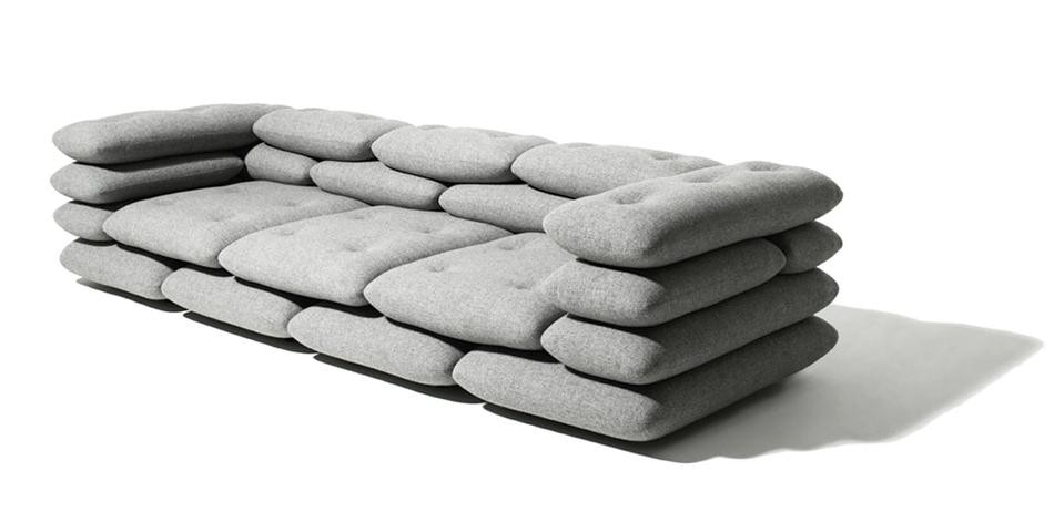 Jens Martin Skibsted: We wanted to make something really comfy – so to start off we were inspired by a pile of pillows. We wanted to organize them in a rational way and thought of stretcher brick bond known from architecture. We found a new mechanism to tie the stack of pillows together. To bring in a bit of tailor quality and old school furniture reference we topped it off with buttons. We couldn't find the right ones on the market, so we designed some. We made the in concrete fiber to stick with the architectural references.