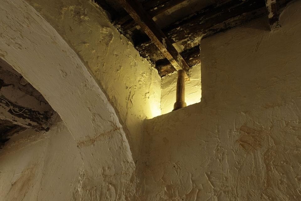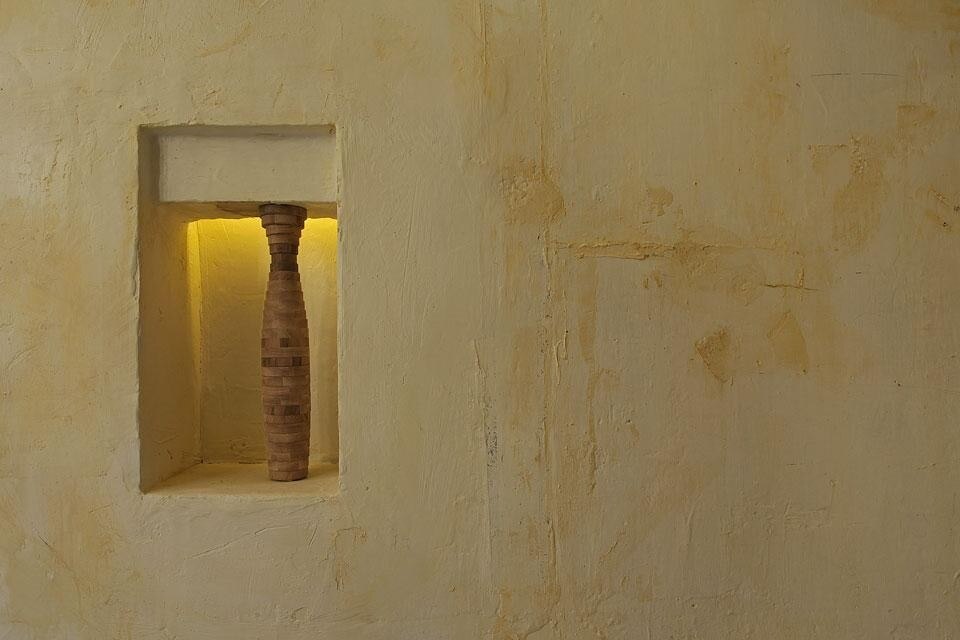 This is the setting for Italian architect and designer Michele De Lucchi's installation Colonne portanti, or supporting columns, curated by Emilia Giorgi. De Lucchi was asked to come up with his own interpretation of the space, inhabit it and take the opportunity to uncover traces left by its long history, the indelible memories vigilantly preserved by the thick stone walls of this space, which formerly harboured a glasswork workshop. The architect and designer saw what had been a neighbourhood workshop as a place to unearth signs of time. He discovered small spaces, niches and holes, dug new ones when necessary, and inserted columns into them. Every one of these small locations becomes a world in itself, a space to be explored, worthy of a specific response. De Lucchi constructed wooden columns for each of these niches with his own hands.