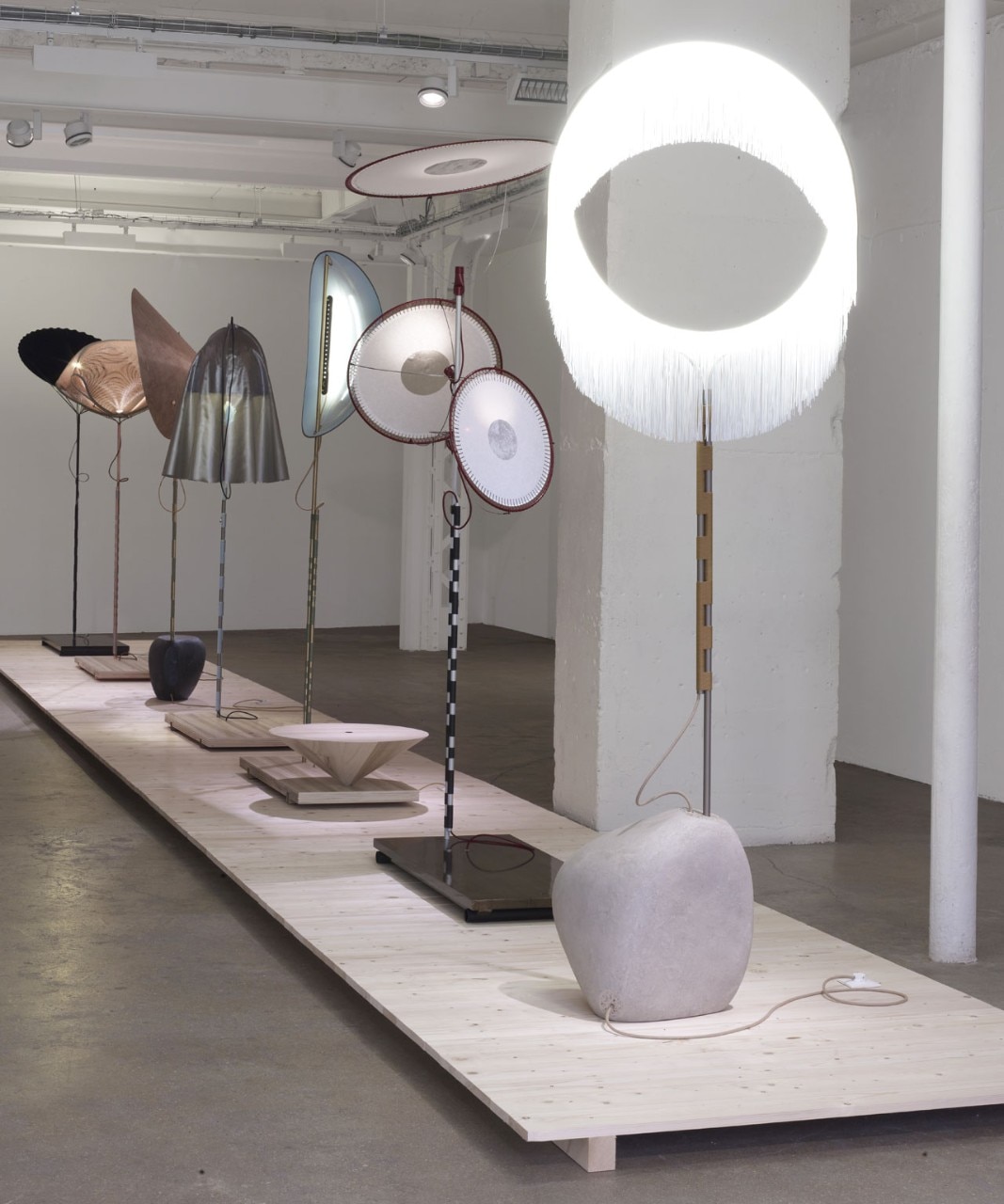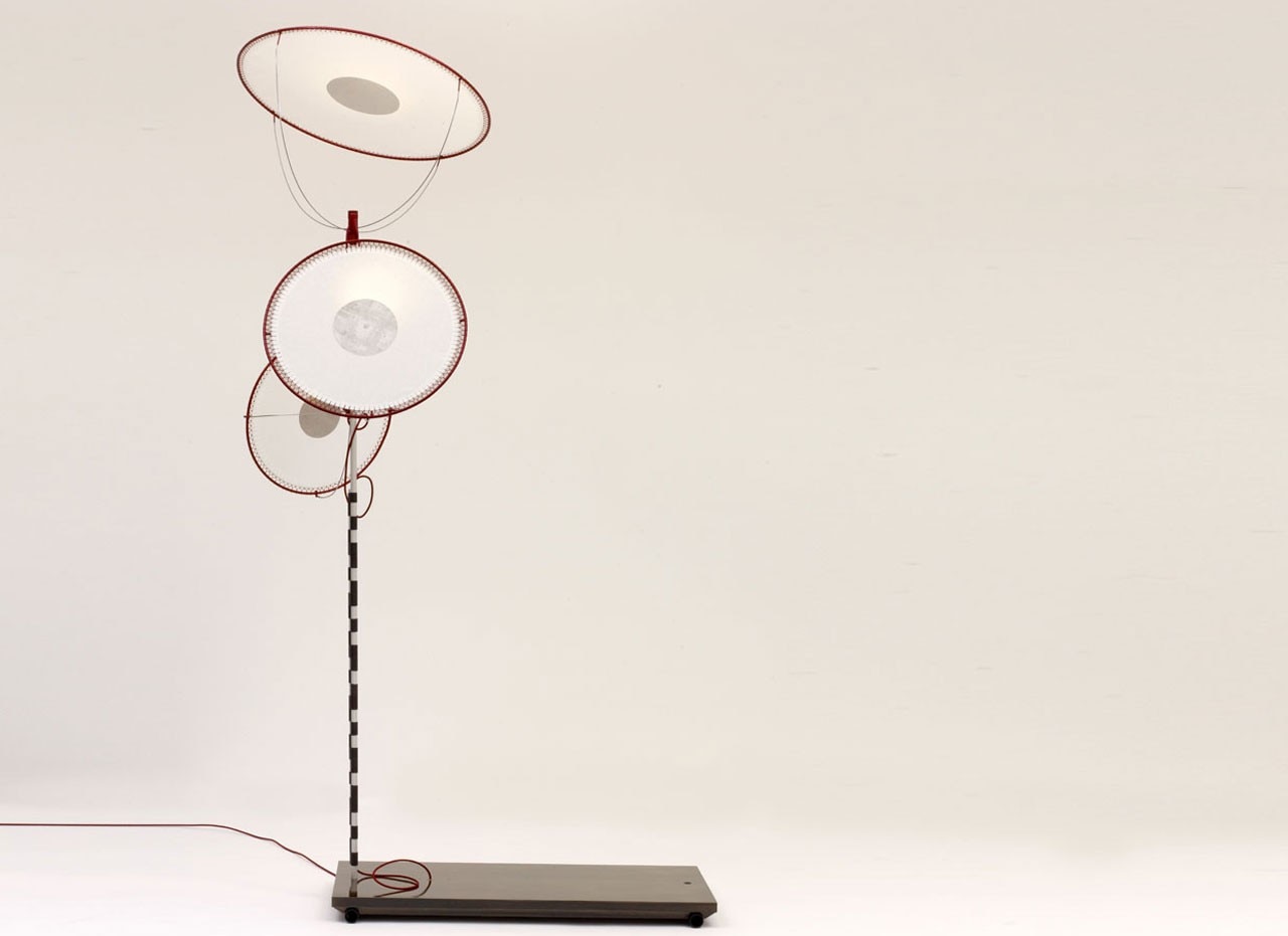 Chuugi, a "black hole" lamp, features a light-absorbing, velvety flocked shade made of carbon and glass fibre with integrated LED lighting. It is lightly held aloft with a structure of blackened metal spokes. The poles are made of anodized aluminium bound with cord, while the base is Tulip wood with a lacquer finish.