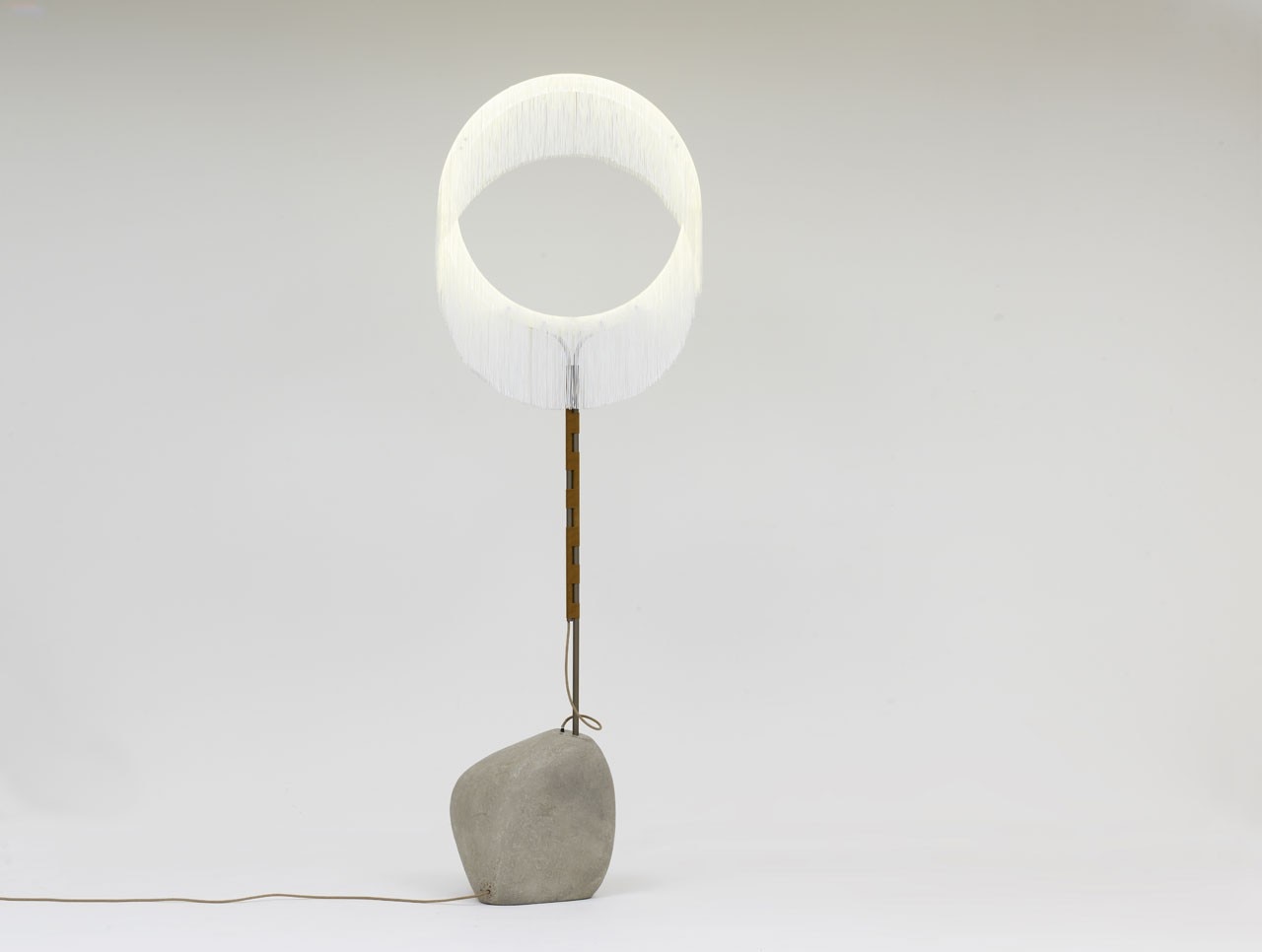 Gi, a chord lamp, features a circular perspex tube covered by a chord fringe sock which diffuses the light. LED light strips are mounted to an aluminium ring held within the perspex, while a steel structure transfers electricity to the ring. The shade is held by bound aluminum poles anchored into a polyester stone base that is cut off from the top.