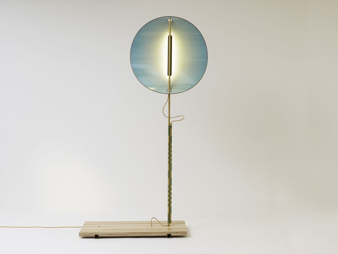 Makoto, a reflection lamp, features a curved circular anodized aluminium shape covered with reflection foil, which is commonly used for traffic signs. The foil is printed with a gradient that plays both with the ambient light and the light from LED sources held to the pole by magnets. The poles are made of brass tubes bound with cord, and the base is Tulip wood with brass supports.