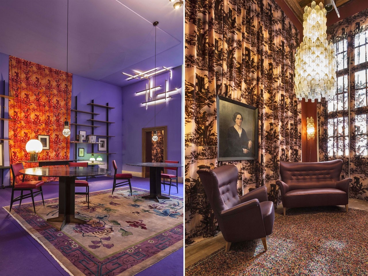 Next come a few references to the Orient, as only Yashar can do: a lovely Pompeian room with Luci a parete by Melchiorre Bega and a great deal of Ponti delightfully mixed with the irony of Martino Gumper. Then, splendid lacquered tables by Isabelle Cornaro and fantastic suspension lamps by Paavo Tynel.