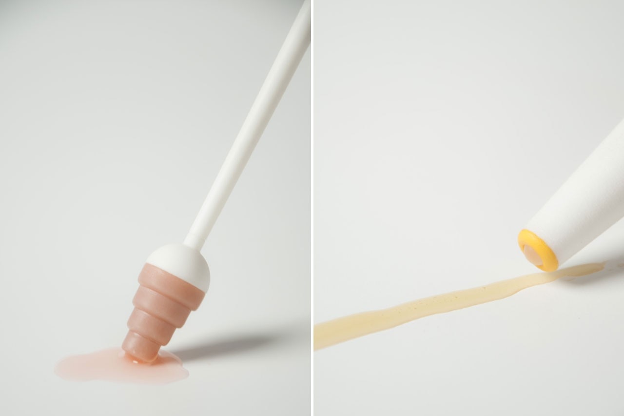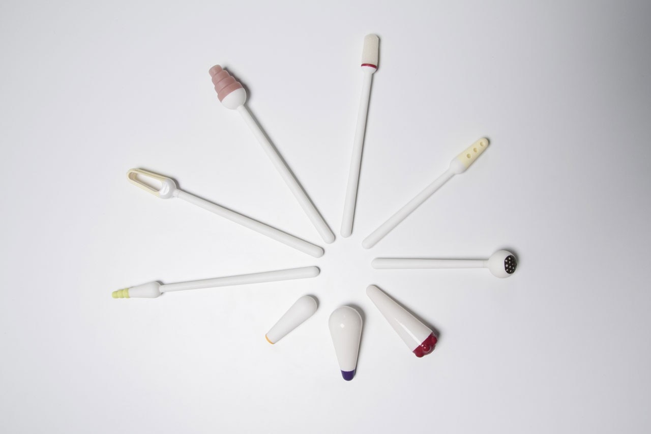 reveals a flavor burst and it leaves a tingly sensation and sound in the mouth when it goes away. Right: Dip. This flexible piece is for dipping. After dipping it into a paste you can either lick it or brush it onto your