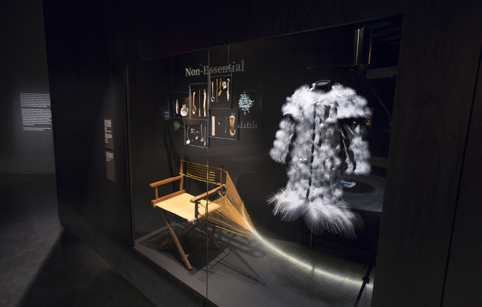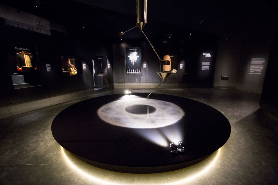 The watch exemplifies one of the exhibition’s unifying themes; time. This is present in the ten years Italian goldsmith Giovanni Corvaja took to master spinning gold into thread, and the 2,500 hours this technique took to realise The Golden Fleece (2009) headpiece, made from 160 km of gold thread. The absurdity of this endeavour is something that the curators recognise; often the producers of luxury artefacts are making for no one other than themselves. Temporality also underpins the central work in this section: Canadian designer Philippe Malouin’s Time Elapsed (2011) for Lobmeyr. This space-age kinetic sculpture slowly draws a circular pattern in sand  – an apt material to represent both the immaterial and material ingredient of the Austrian firm’s opulent glassware.