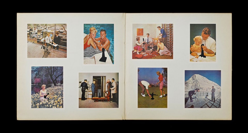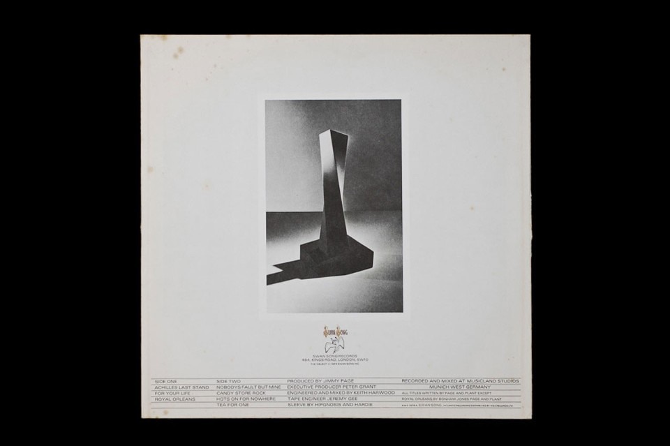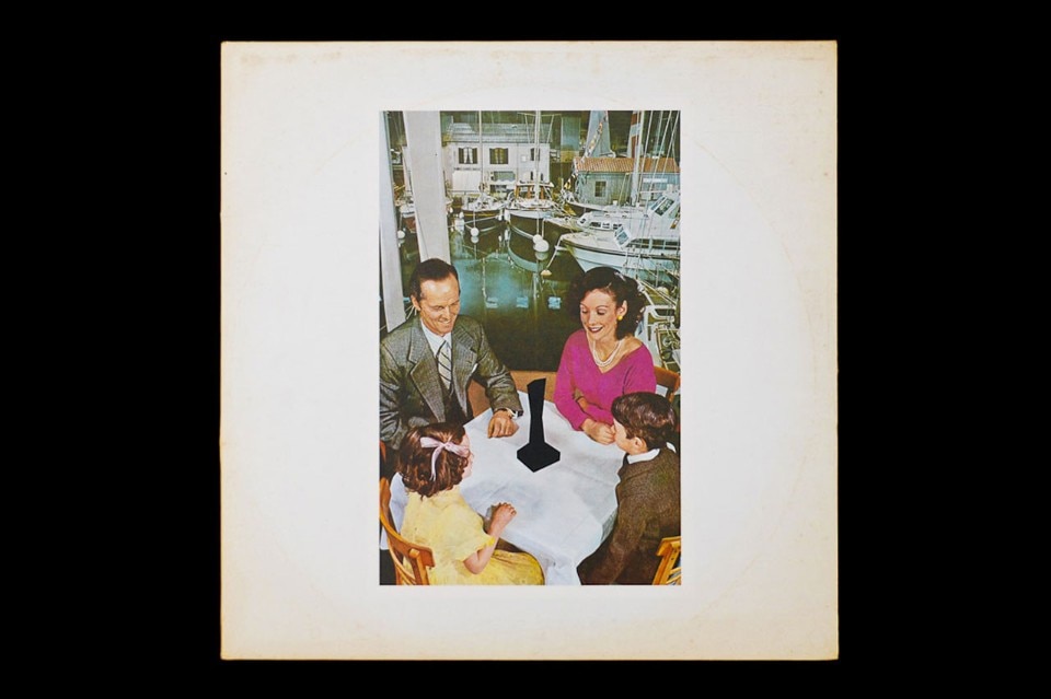 Hipgnosis drew these pictures from old 1950s’ issues of National Geographic, gave them a somewhat sci-fi film brightness and added the black silhouette, which they wanted to call “The Obelisk”. Given Jimmy Page’s Satanic and occultist fascinations – he was a follower of the teachings of occultist Aleister Crowley -the “presence” brings a disturbing atmosphere to the serene mundane pictures. The black object is unidentifiable and inexplicable; a Surrealist object springs to mind, a skeleton at a party. Led Zeppelin’s record company Swan Song Records ordered 1000 numbered plastic copies of the small black obelisk, today reminiscent of a model city skyscraper, to promote the record and they sold like hotcakes.
