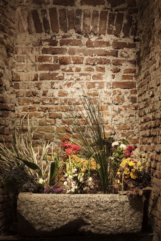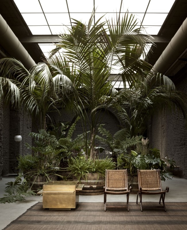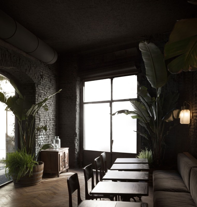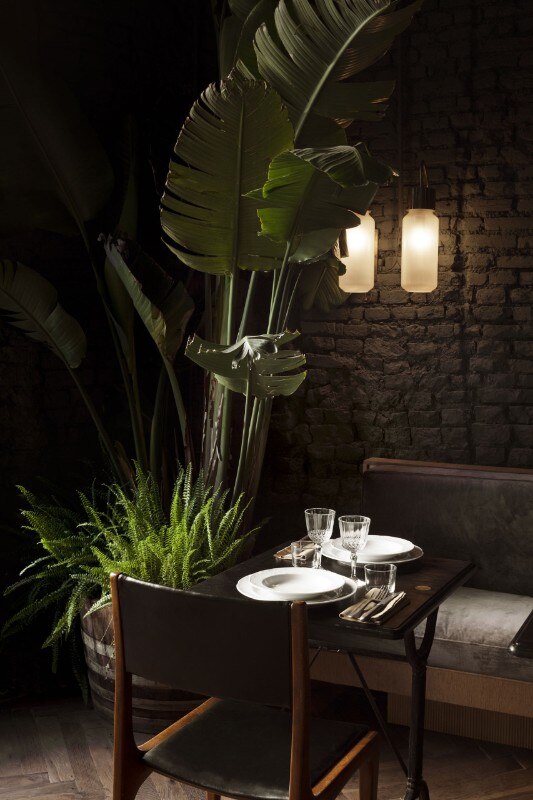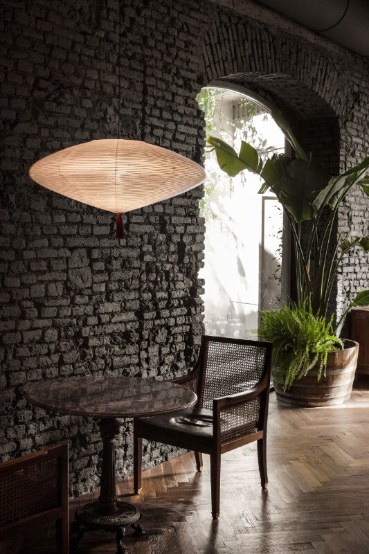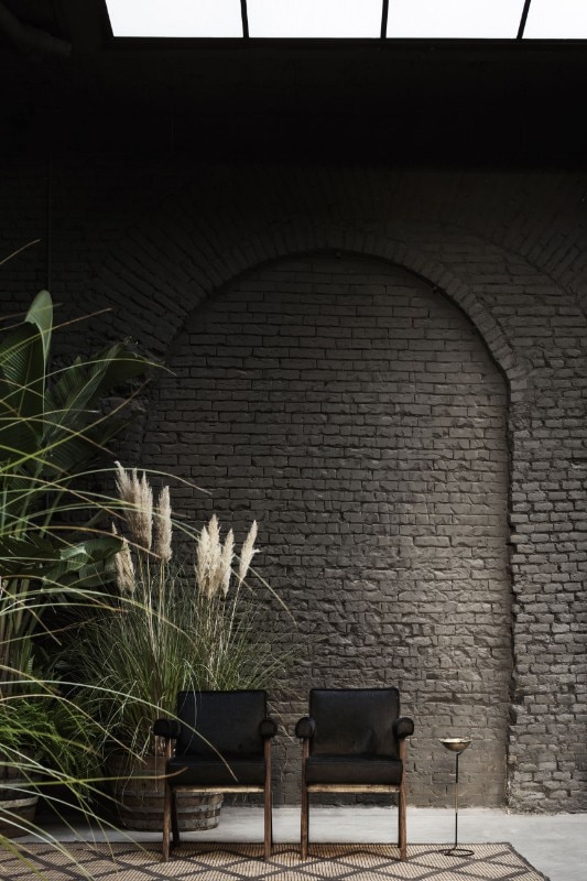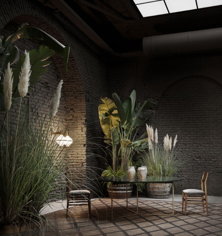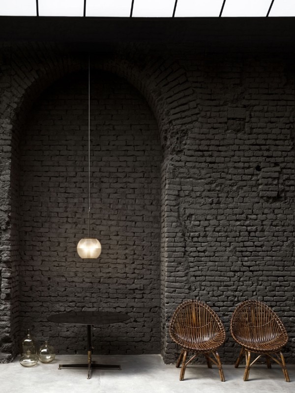 The renovation project removed the plaster layers from the interior and revealed the original brickwork and floors. “We wanted everything, from the furniture to the plants, to look like they had been here forever”, Bauer Grung explains. The overall mood is the result of a play with contrasts: the smoky grey walls, furniture featuring classic design, and the attention to details. The space hosts the Six design Gallery, the Sixième bistro and the green design boutique ‘Irene’. The gallery mixes together Vietnamese vases and modern Scandinavian furniture, nomadic rugs from Altai and tables by Gabriella Crespi, chairs by Gió Ponti and armchairs that Le Corbusier and Pierre Jeanneret created for Chandigarh in India.