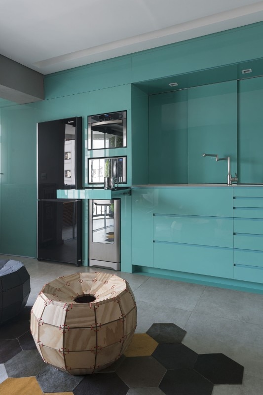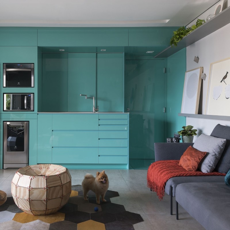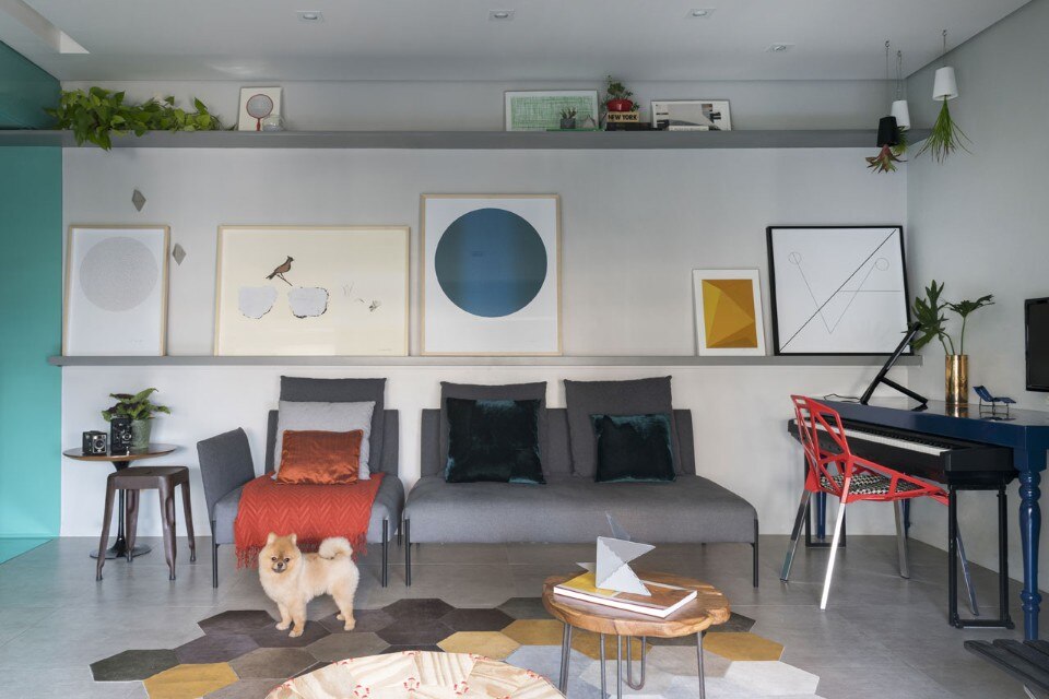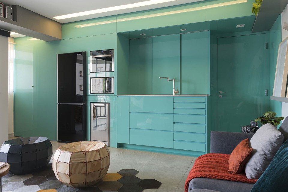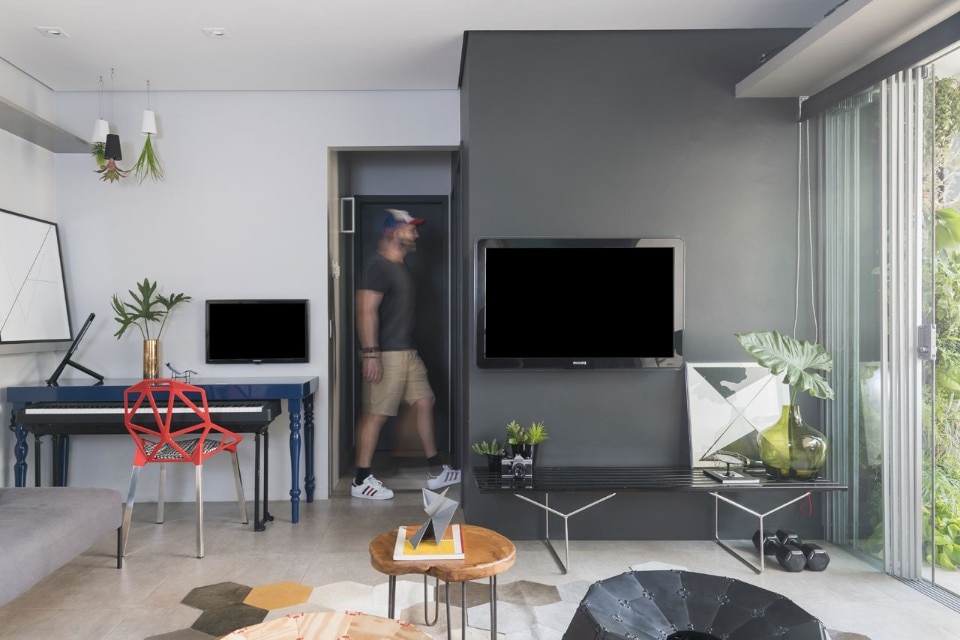 Brazilian architect Flavio Castro renovated an apartment in São Paulo, Brazil, transforming a compartmentalized floor plan into an integrated space. The clients – two young brothers – wanted a space that could be easily adapted to different possible scenarios where work, eating, cooking and laundry could happen in a smooth way.