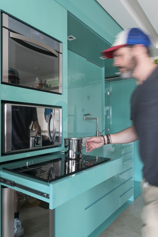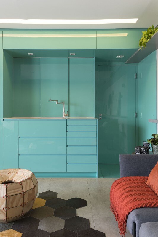 Custom made furniture was the focal point of the design. All functions, including the cooktop and pantry, have been camouflaged through pivoting doors, sliding doors and drawers. The overall colour scheme is determined by one bright aquamarine equipped wall. Privacy is guaranteed by two private bedrooms, while hybrid and mobile furniture keep the space flexible.