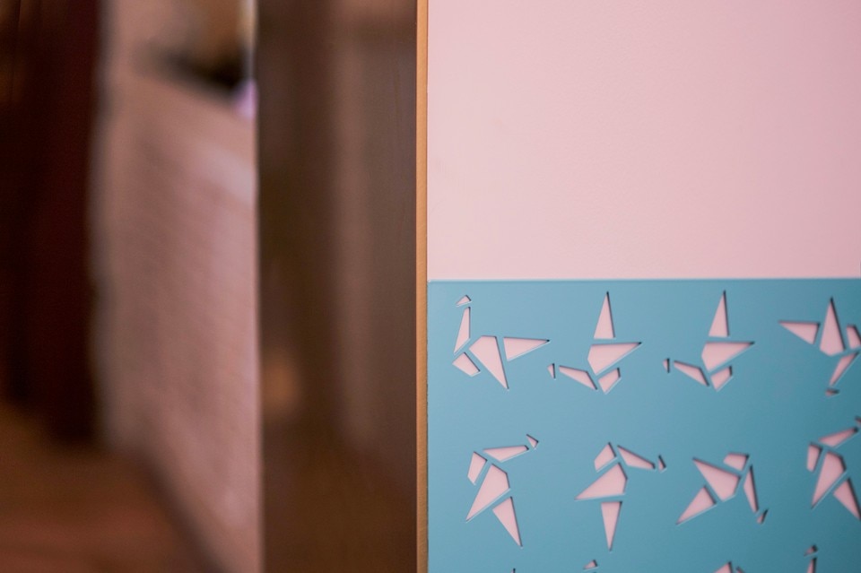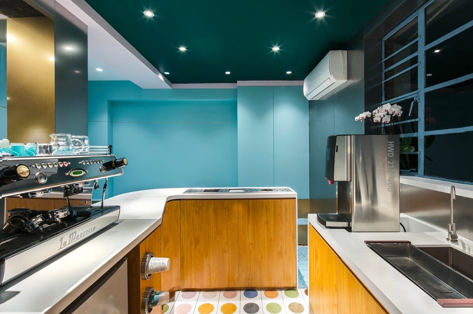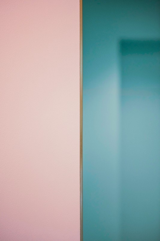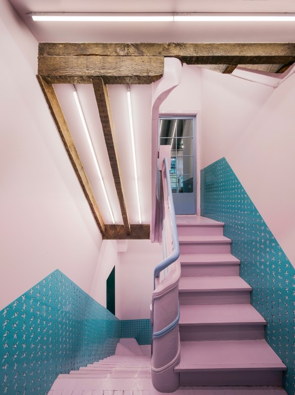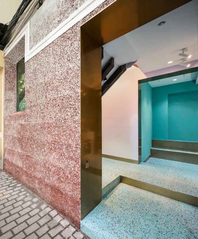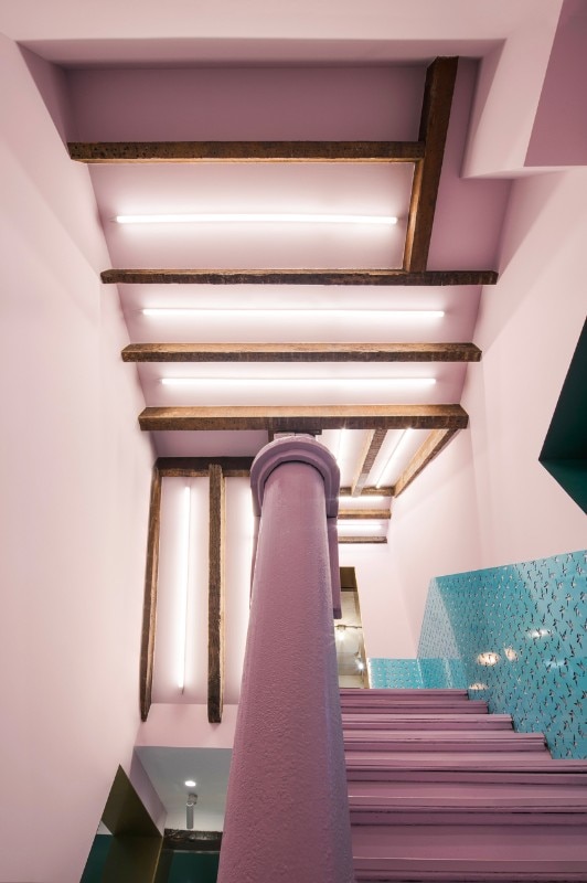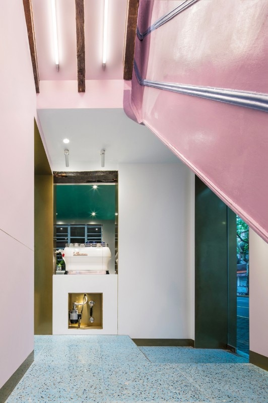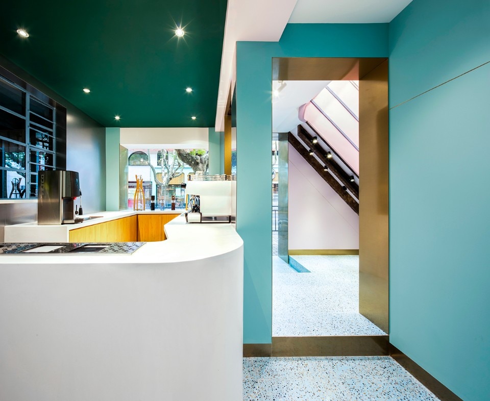 The compact scale is one of the main objectives of the project. The original ceiling and decorations are removed to re-expose the original boiserie of the old building. The wooden beams and the structure are waxed and reinforced. Green blue and light pink are used for the entire scale and create a dreamlike atmosphere. The logo of Paloma Cafe, which is a little bird, is cut on steel panels attached to the walls of the staircase. Pink, navy blue and dark green are the colors chosen that make up the color palette, coordinated with the brass and the original color of the woods. Even the terrazzo floor is customized according to the color of the wall. During the renovation, the designers tried to keep the wooden structure as before. The brass wraps part of the ceiling structure as the extension of the linear element of the first floor and becomes part of the bathroom track.