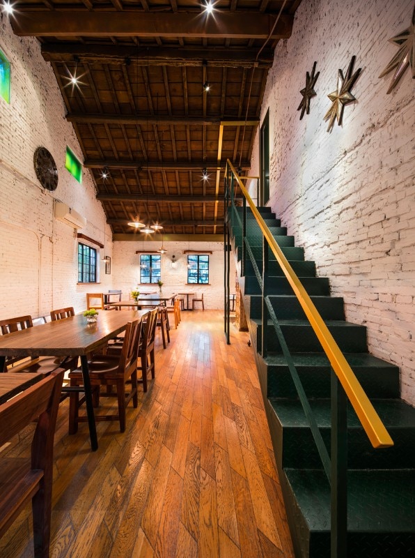 Paloma Cafe in Shanghai renovated by dongqi Architects is located in a building with a history of almost one hundred years. The project includes the renovation of the entrance on the first floor, the second and third floors and part of the façade. During the design process, architects opened most of the complicated and compact spaces to expose the original structure of the old building. The contrast between old and new materials is certainly unique, in which historical elements are traces of the past. The new façade is the classic style of local architecture. For all the small intricate spaces in the original interior, a brass line is designed throughout the building from the entrance and extends to the second and third floors as a subtle clue.