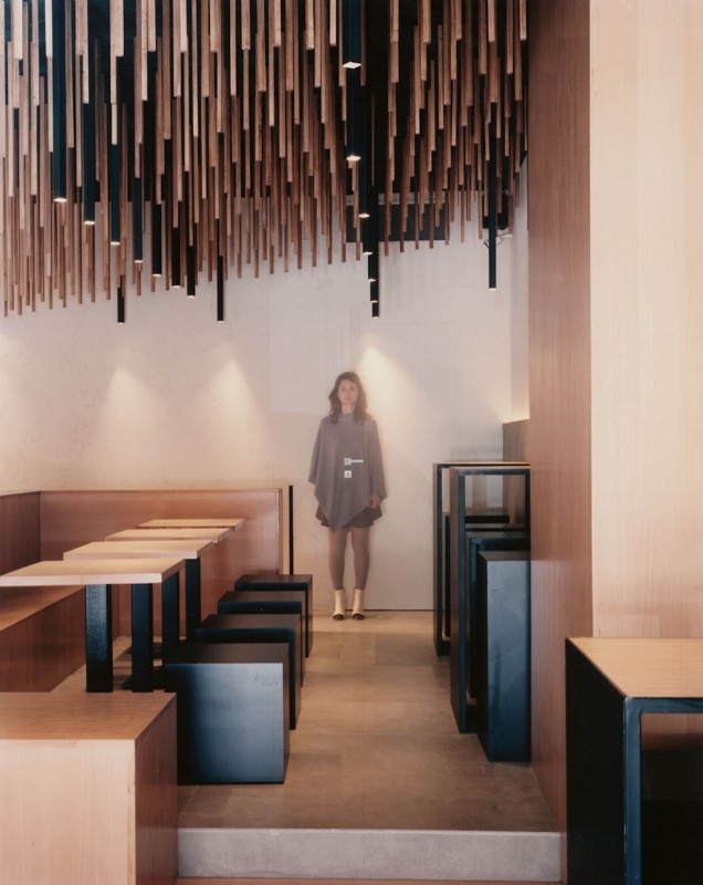 The result is above all our vision, as I described above. We interpreted the idea of a space in continuity with the street and the ground underneath it. This a fast–food eating-house with a quick turnover of patrons, so the aim is not a closed–in area where you settle down, but a fluid space of passage for a brief stay.